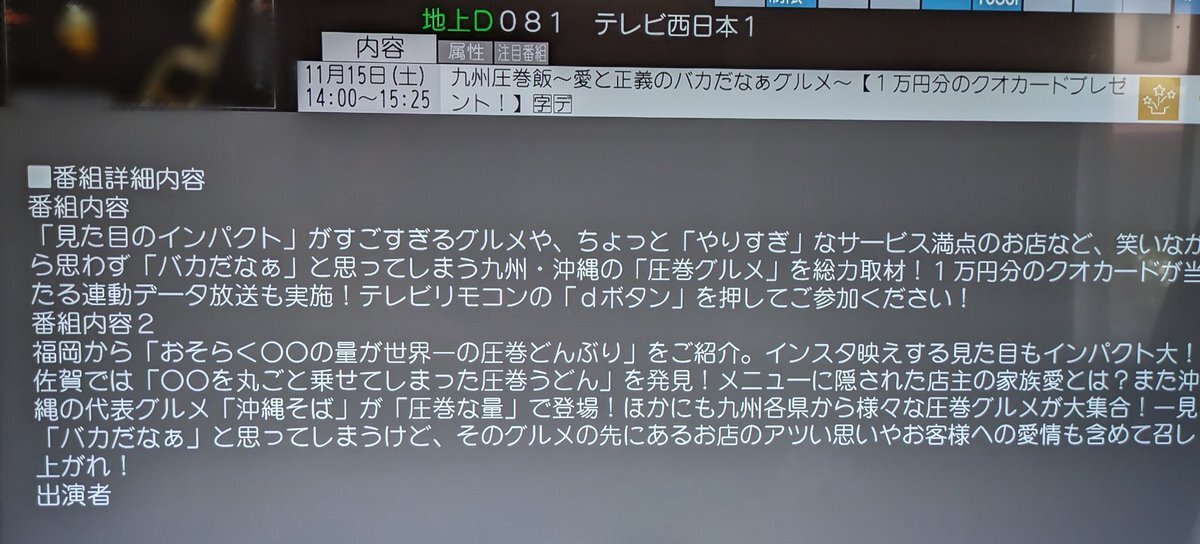 九州圧巻飯 明日午後2時放送📺️ 11/15 (土) テレビ西日本 みんな見てね〜📺️ #TNC #九州圧巻飯 #高校生ナレーター 🎙️ pic.x.com/ZTSo8b2u3u x.com/telebee_tnc/st…