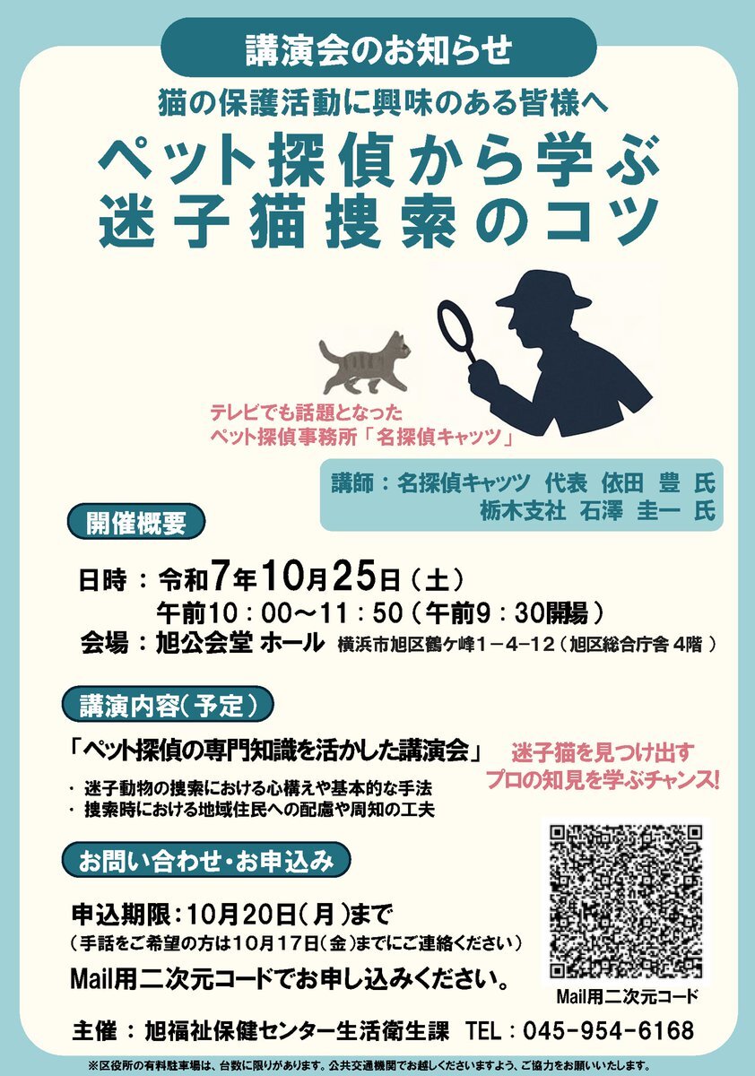 【講演会予告】 TVでも紹介されている「名探偵キャッツ」による迷子猫を「飼い主のいない猫」にしないための捜査の実例などを紹介。猫に関心のある方必見。 日時:10月25日(土)10時~/場所:旭区役所4階公会堂🐾 詳細は▼ city.yokohama.lg.jp/asahi/kurashi/… #猫 #TNR活動 #迷子猫 #ペット探偵 #保護猫 #地域猫 pic.x.com/umG89aE5W0
