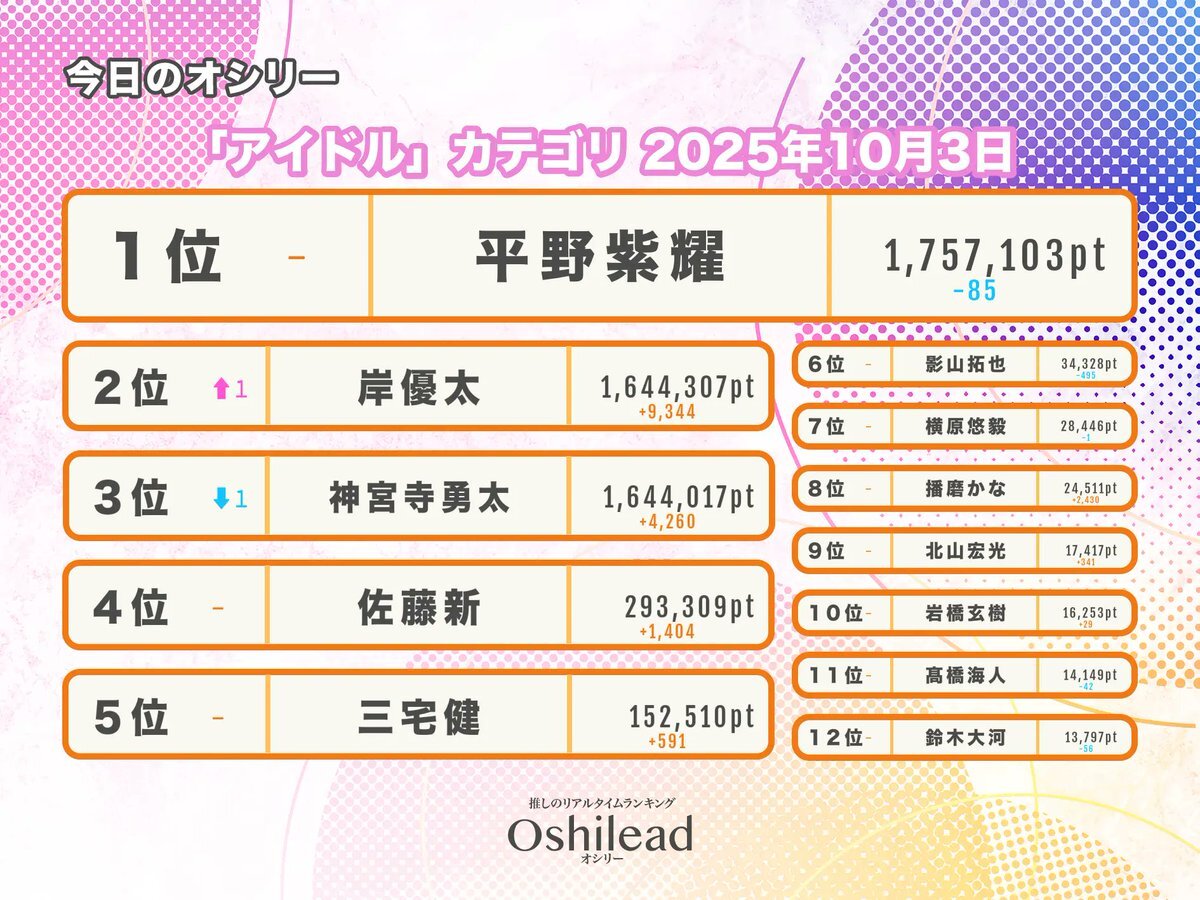 【⚡️今日の注目カテゴリトップ12⚡️】 10月3日 #アイドル カテゴリの結果は… #平野紫耀 #岸優太 #神宮寺勇太 #佐藤新 #三宅健 #影山拓也 #横原悠毅 #播磨かな #北山宏光 #岩橋玄樹 #髙橋海人 #鈴木大河 ▼あなたの推しを応援しよう▼ oshilead.com/ranking.html?c…