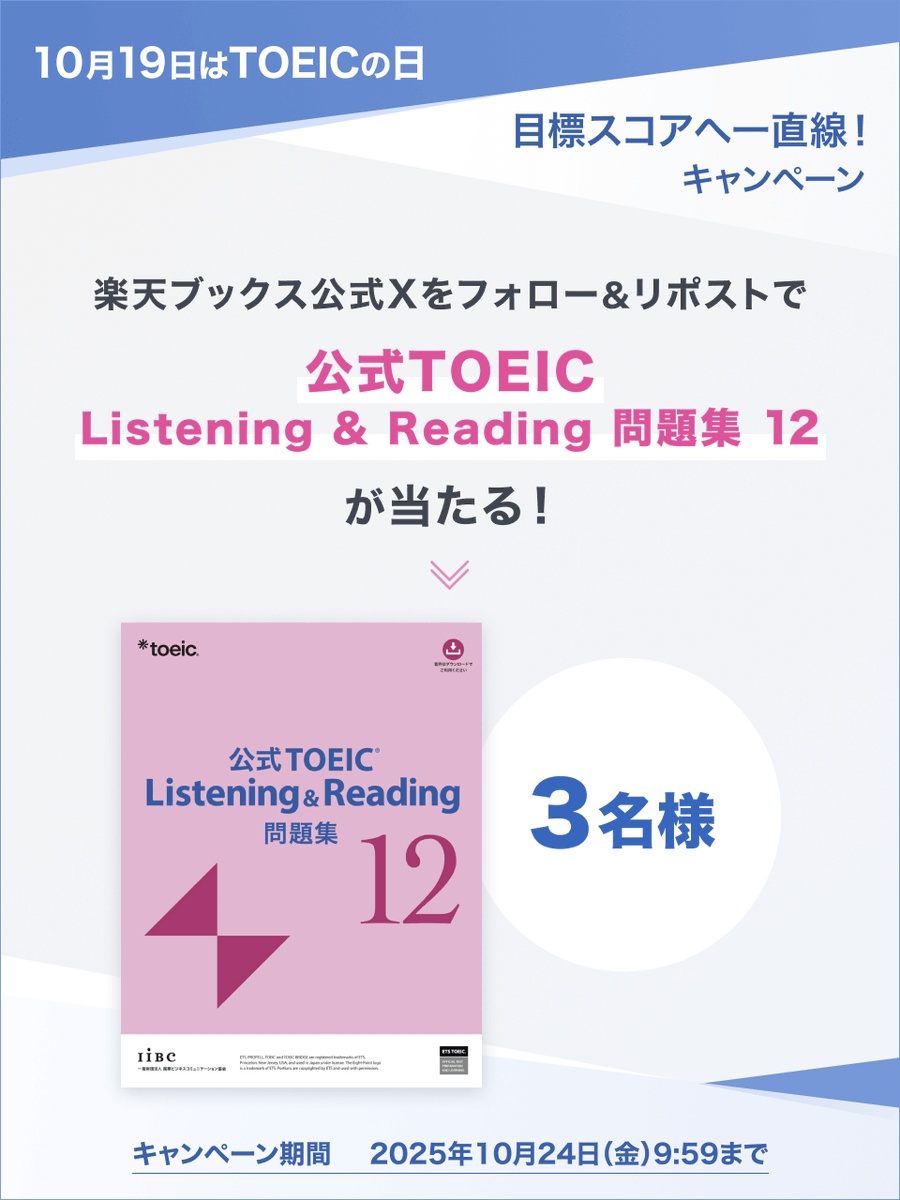 ✨10月19日は #TOEICの日✨ 目標スコアへ一直線!キャンペーン🚀 『公式 #TOEIC Listening & Reading 問題集 12』を【3名様】にプレゼント🎁 応募方法 ①@rakutenbooksをフォロー ②この投稿をリポスト 10/24 (金) 9:59まで⏰ 特集ページでは、最近発売した参考書もご紹介中❣️是非ご覧ください☺️ pic.x.com/NglGem9VG6