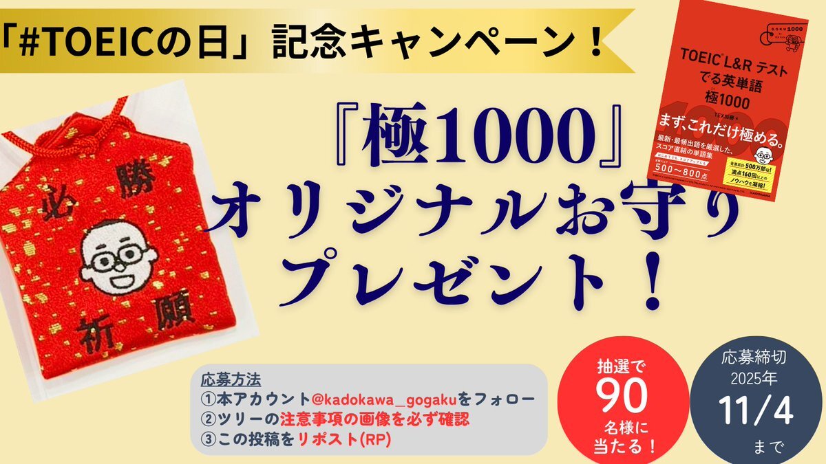 🌟#TOEICの日 記念🌟 📘『極1000』でスコアアップを目指そう!🎉🎉 / 抽選で9⃣0⃣名様に 🎁オリジナルお守りをプレゼント🎁 \ 応募は👇 ① @kadokawa_gogaku をフォロー ② 注意事項画像をチェック ③ この投稿をリポスト! 🗓️応募締切:2025/11/4 23:59まで #極1000 #TOEIC pic.x.com/inNFoKBvWE