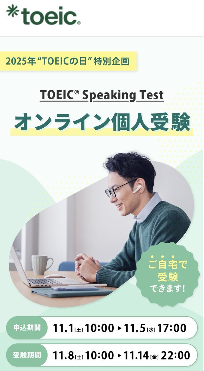 TOEICのスピーキングテストが自宅で受けられる企画! 公式記録にはならないけど、スピーキング受けるの迷ってる人にはおすすめ! #TOEIC #TOEICSW #TOEICの日 group.iibc-global.org/campaign/toeic… pic.x.com/EGsEUJlING