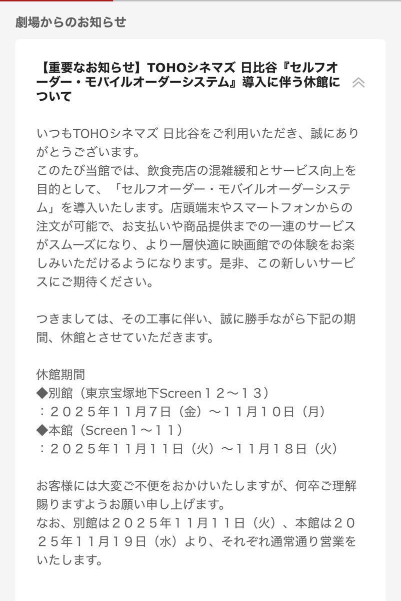 TOHOシネマズ日比谷(スクリーン1〜11)は、11/11〜11/18まで休館です。『国宝』上映終了したわけではないです!きっと再開します‼️ #国宝 #休館 #TOHOシネマズ日比谷 pic.x.com/7Xf5s4kuy0