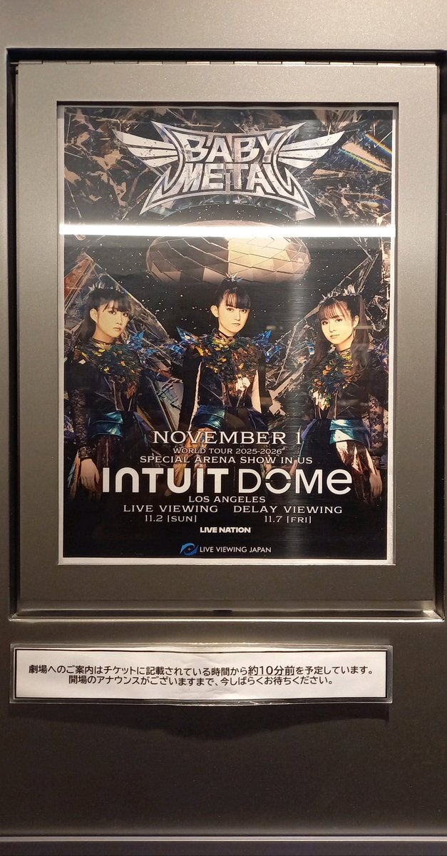 #BABYMETAL #INTUITDOME #TOHOシネマズ錦糸町楽天地 今日は仕事帰りに、先日11/2にロサンゼルスで行われた公演の、ディレイビューイングを観に来たよ🦊 開場まであと一時間… 意図せずセトリが目に入ってきちゃったのは残念だけど、アチチな夜を楽しんできます(^-^ゞ pic.x.com/DxAXBijbSa