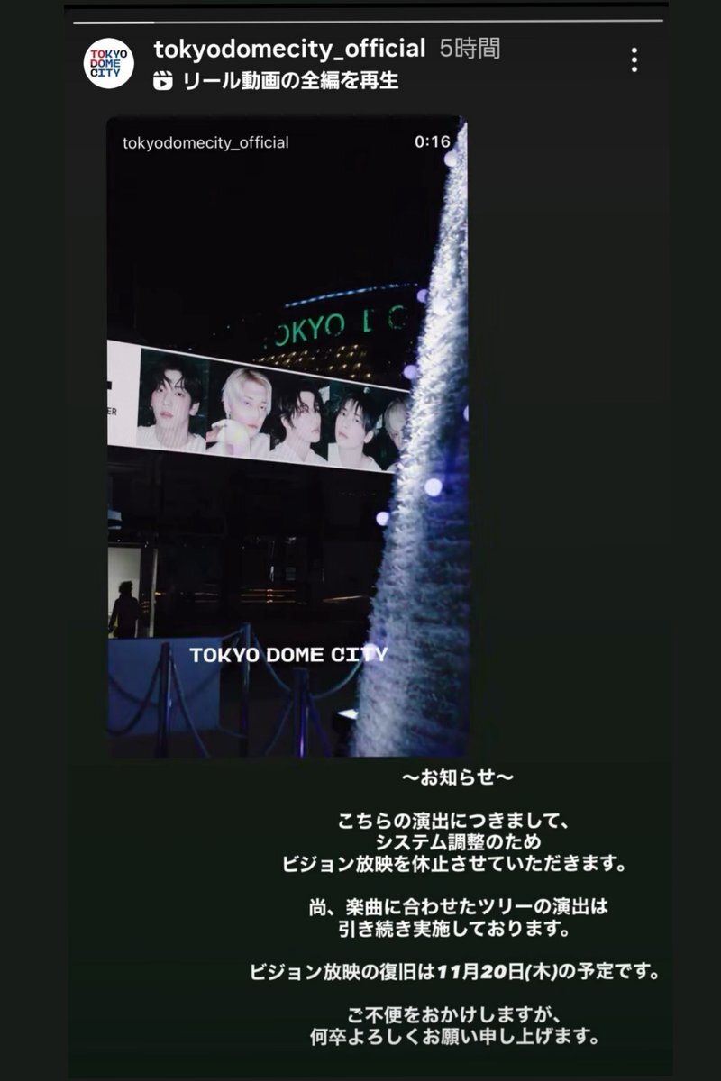 東京ドームシティのツリーを見に行こうと思っているmoaちゃん 現在トゥバちゃんのビジョン放映は休止中で、20日(木)に復旧予定みたいです #TOMORROW_X_TOGETHER #TXT #TXTと過ごす冬 #TOKYOSNOWDOMECITY #東京ドームシティ #TokyoDomeCity #東京ドームシティウィンターイルミネーション pic.x.com/nayypYwSk3 x.com/TokyoDomeCity_…