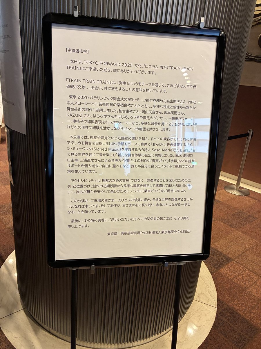 芸劇で「#TRAINTRAINTRAIN」に乗ってきた。人間は誰もが詩だね。言葉も音も身体も考えも違うし全てをわかれなくても、私は舞台上に存在している体音振動温度呼吸風からそれぞれの生き様と詩を感じました。劇場に音声ガイドや字幕などの鑑賞サポートが常備される日まで、私は私なりに走るよ🛤️ pic.x.com/kIxCQAKyKd