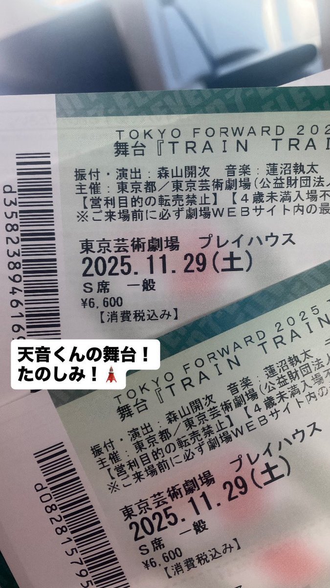 舞台 TRAIN TRAIN TRAIN 明日、11/29 12:00~チケット譲ります! 急遽体調不良で行けなくなってしまい、 買ってくださる方探してます🥲 譲:舞台 TRAIN TRAIN TRAIN 11/29 12:00〜1枚 席2列目 #東京芸術劇場 #TRIAN3 #岡山天音 #TRAINTRAINTRAIN