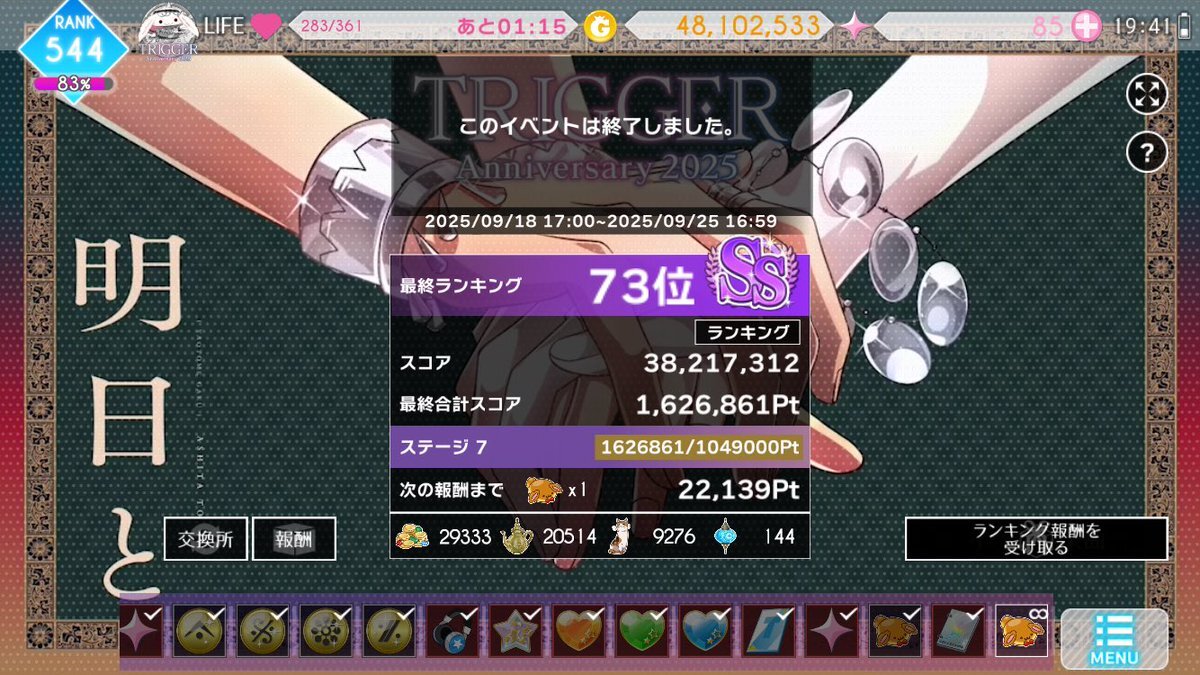 最終日2桁着地がかなりギリギリの所にいた私。次男の⚾️試合が2試合ありラストチャンスは12:00〜13:30の1時間半。伸び代が残っていたのは新曲・HV・DFの3曲。どの曲に掛けるかめちゃくちゃ迷った。ここの選曲を間違えると2桁の夢は途絶えると思った。 ↓↓↓ #TRIGGER記念日2025