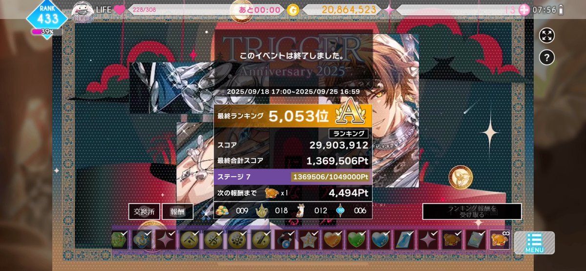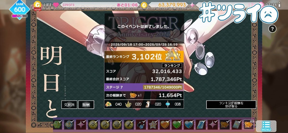 長男の目標はスコアタ初のSS着地だったけれど、2桁着地が見えてきて、いつもTRIGGER記念日は省エネだった私も初の2桁着地してみたい!という思いが強くなりました。そんな気持ちが追い風になったのか、いつもより的確に発動の見極めが出来たような気がします。 ↓↓↓ #TRIGGER記念日2025