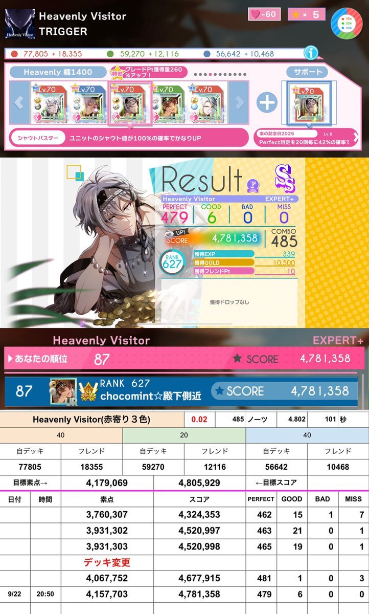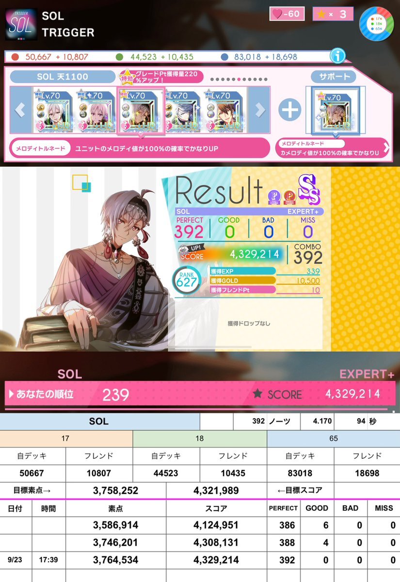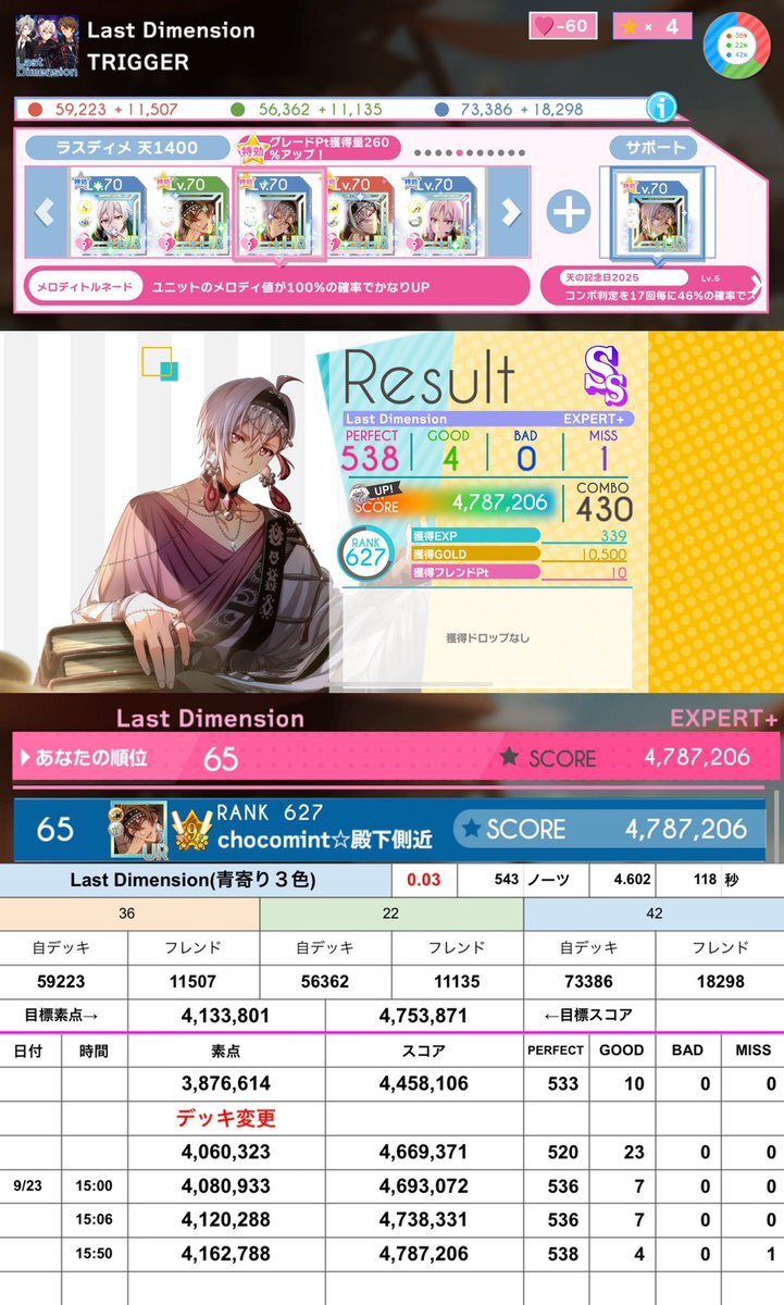 とにかく焦らず冷静に。たった1回のチャンスを逃さないように。途中チェックポイントでいつもより上振れてた事でちょっと心臓バクバクしたけど、GOOD出さないように、縮小繋がって、、!!と思いながら素点確認したらめちゃくちゃ更新してて😭😭✨ ↓↓↓ #TRIGGER記念日2025