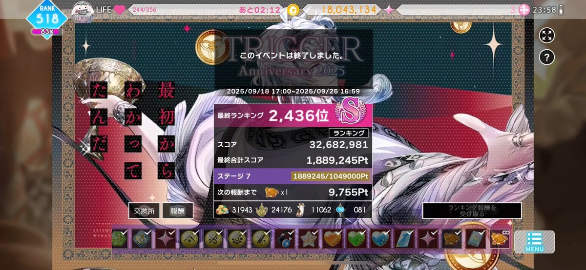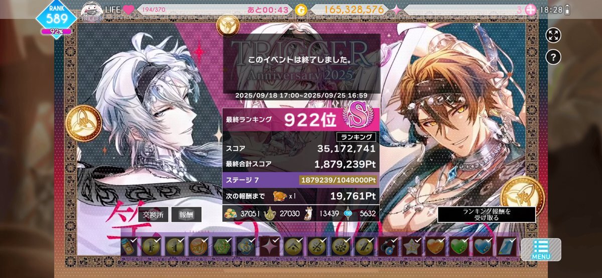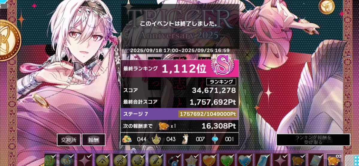 #TRIGGER記念日2025 イベントお疲れ様でした❕ 3年間アイナナから離れて出戻りした身ですのでカードも弱ければブローチも全くない状態でしたが、にしてはといったところでしょうか、、、、 次はSSいきたいですね 人脈もない中で走りきれたのはフレンド様のおかげです。本当にありがとうございました❕ pic.x.com/VZDCoNWgmZ