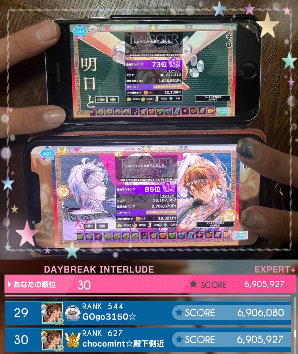 #TRIGGER記念日2025 TRIGGER担の皆様、記念日お疲れ様でした。カードを貸して下さったフレンド様には感謝の気持ちで一杯です😭 今年は10周年なのでTRIGGER愛を全力こめて彼女と一緒にスコアタに挑みました💪 SSは無理でしたが何とか1000位以内で良かった😂 ギリギリですがスコアタで初3桁💕ヤッタ pic.x.com/mmsGfsOVFM