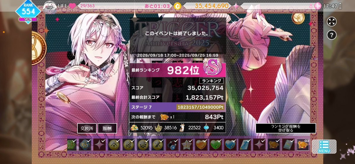 スコアタお疲れ様でしたー! なんとか1,000位以内に残れた😂 100連して特攻は楽1枚で、 龍引けなかったことを引きずってたら、 終了日を明日と勘違いして、アプリ開いて絶望した😇 フレンド様、お力添えのありがとうございました🙇‍♂️ #TRIGGER記念日2025 pic.x.com/iSLoSdONFo