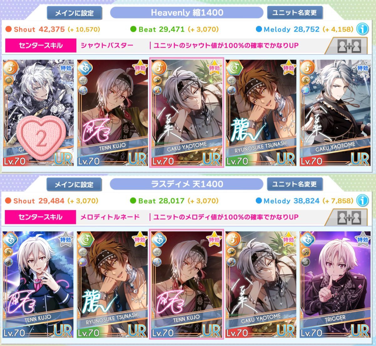各曲編成✍️混色曲🌈 自デッキ全カード 🍀数字なしスキルマ 🍀ブローチ2個開放 フレンド様 🎶Heavenly 🍀記念日2025楽(ALL1400) 🎶ラスディメ 🍀記念日2025天(ALL1400) 手持ちのSUで色を寄せるよりも金特効並べるゴリ押しの方が圧倒的に伸びると気づき伸び代37万生み出した🙌✨ #TRIGGER記念日2025 pic.x.com/Fnr5NPGQmT