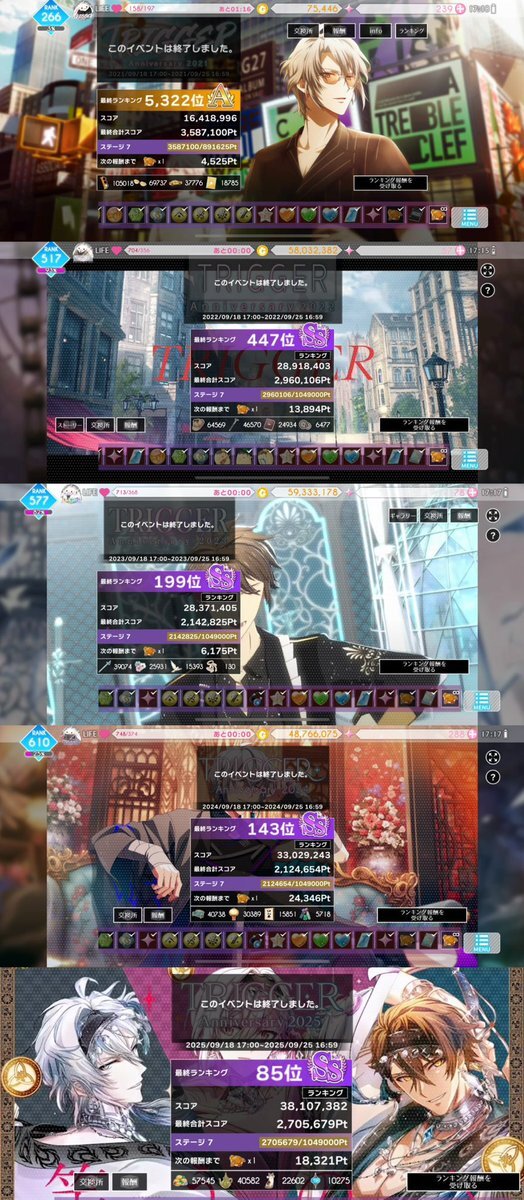 ⚔️TRIGGER記念日戦歴⚔️ 2023までは金特効育成無し2024は楽さんのみ。 TRIGGERは時期的に抑え目になってしまうので、2桁着地は今年が最後な気がするけれど、長男と一緒に2桁着地できて本当に素敵な思い出になりました☺️ 一緒に戦って下さった皆様、本当にありがとうございました❤️‍🔥 #TRIGGER記念日2025 pic.x.com/3NDp8t3cnz