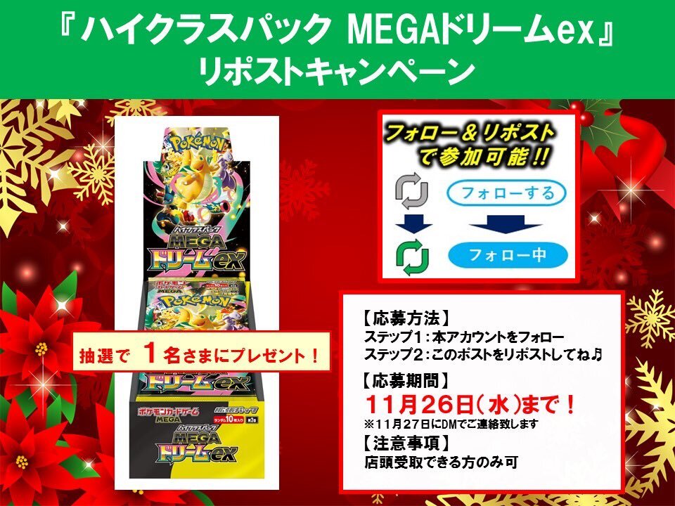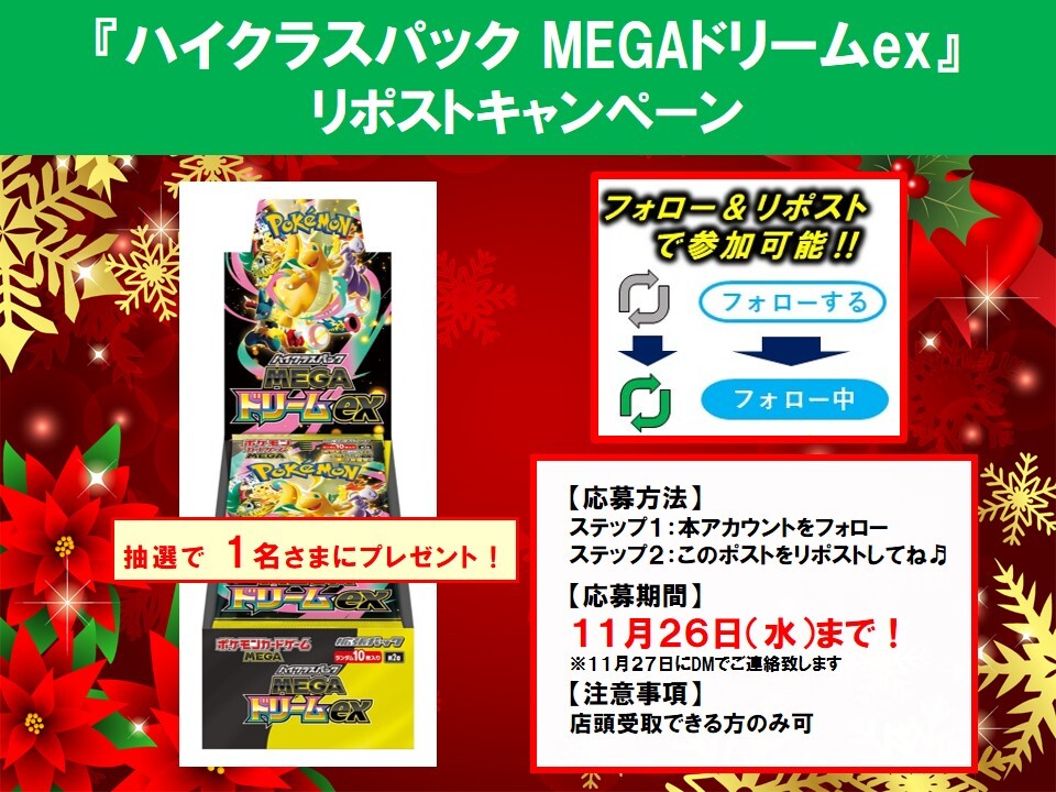 📢リポストキャンペーン📢 抽選で1名様に 11/28発売『MEGAドリームex』を プレゼント🎁 ⏬参加方法⏬ ステップ1:本アカウントをフォロー‼️ ステップ2:このポストをリポスト🔄 応募期間:11/26(水)まで たくさんのご応募お待ちしております😃 #TSUTAYA一関中央店 #ポケカ #リポストキャンペーン pic.x.com/NWUy8uLJqK