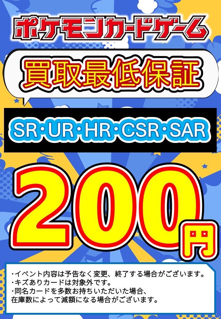 📢【 買取強化継続中 】📢 #ポケカ    🔥★SR・UR・HR・CSR・SAR🔥 🔥「1枚 200円」 買取保証🔥 ▪️傷ありは対象外 ▪️基本エネルギーは対象外 ▪️在庫上限に達しましたら買取強化を終了させていただきますのでご了承ください 是非お持ちくださいませ‼️😃 #TSUTAYA一関中央店 #ポケカ買取保証 pic.x.com/1gOvZB7TZp