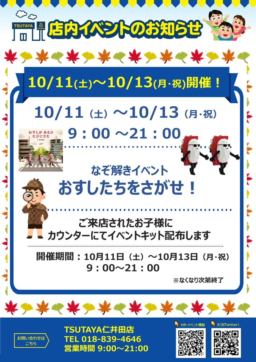 \\イベント情報// 10月11日㈯~13日㈪㈷ なぞときイベント🔍 『おすしたちをさがせ!🍣』 カウンターでイベントキットをもらってぜひチャレンジしてください😊❣️ ご来店をお待ちしております✨ #TSUTAYA仁井田店 #ナイスガーデン pic.x.com/vRiyMN7hd6
