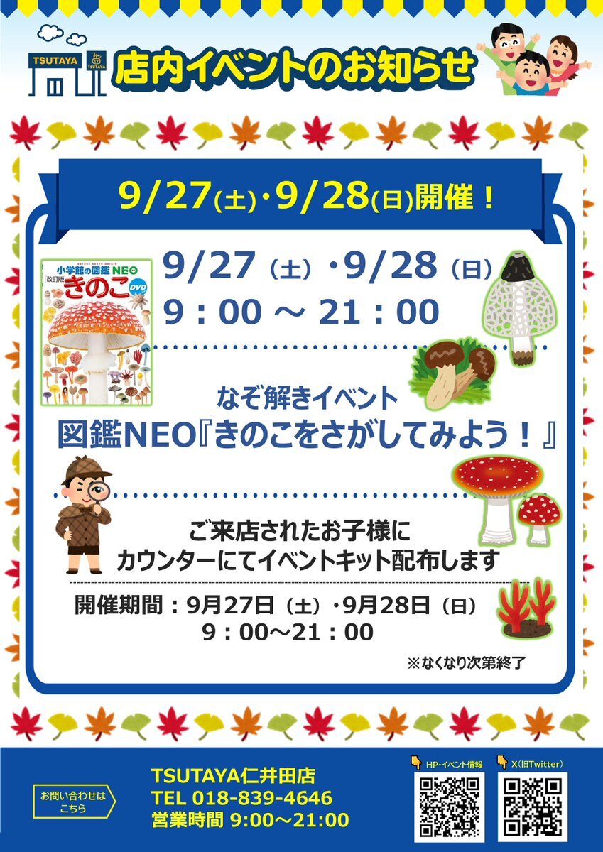 \\イベント情報📣// 9/27㈯・28㈰開催 なぞときイベント🔍 『#図鑑NEO きのこをさがしてみよう🍄』 イベントキットをカウンターでもらってぜひチャレンジしてみてね✨ #TSUTAYA仁井田店 #ナイスガーデン #小学館