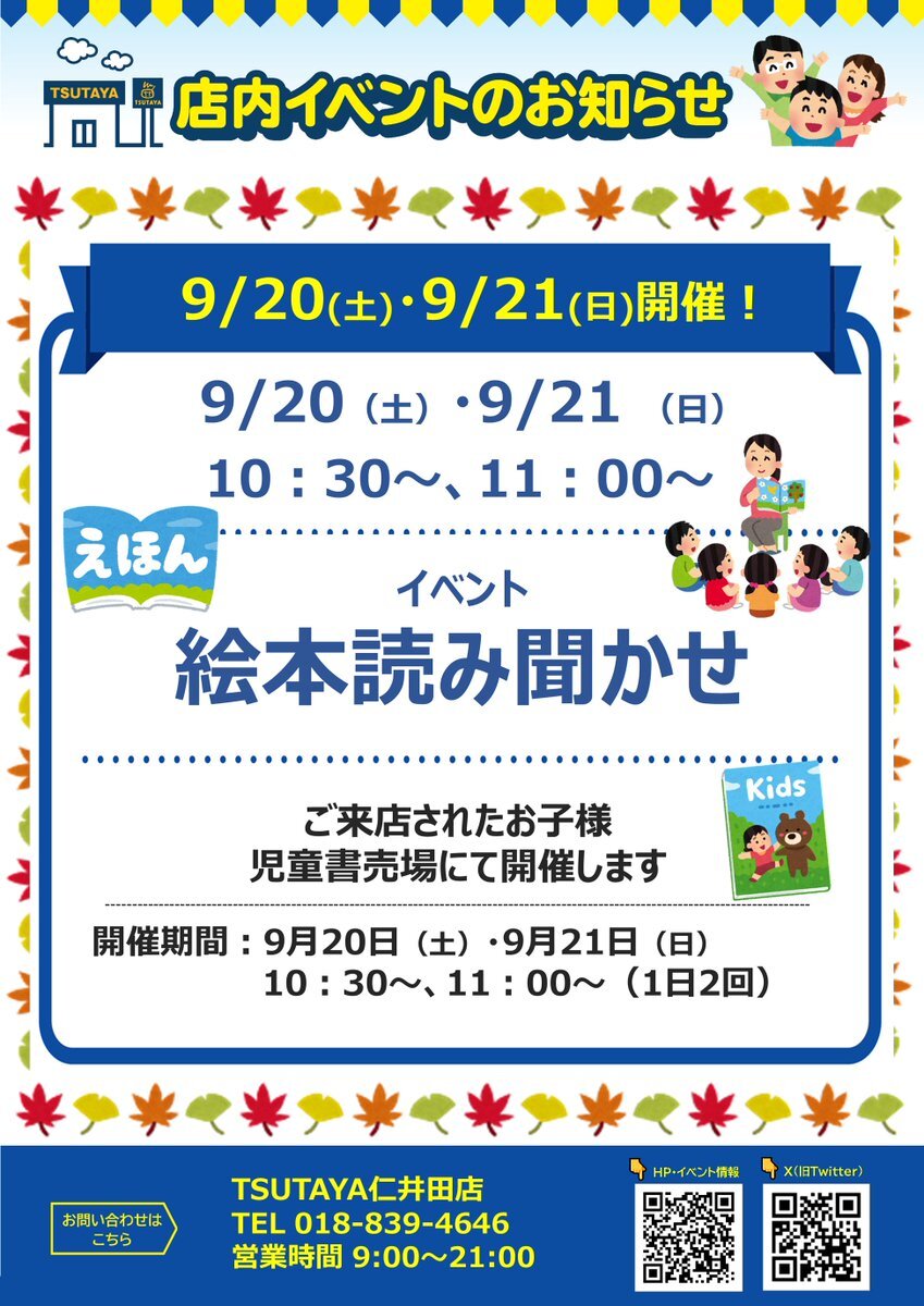 \\イベント情報📣// 9月20日㈯・21日㈰ 『絵本読み聞かせ📖』 ①10:30~②11:00~ 二回開催いたします✨ どんな本かは当日のお楽しみ‼️ ご来店お待ちしております✨ #TSUTAYA仁井田店 #ナイスガーデン