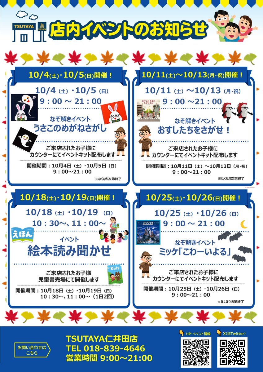 \\👻10月イベント情報🍭// 10月も楽しいイベントご用意してみなさまのご来店をお待ちしております🥰❣️ #TSUTAYA仁井田店 #ナイスガーデン pic.x.com/Ky462FUaQf