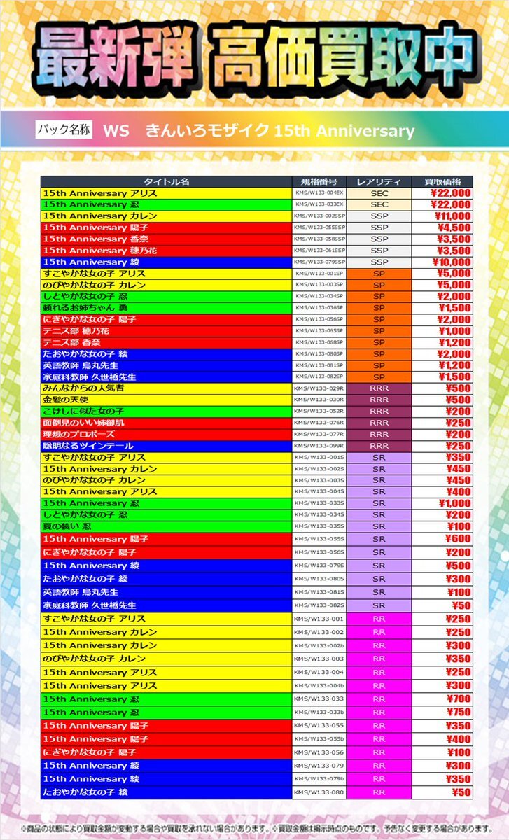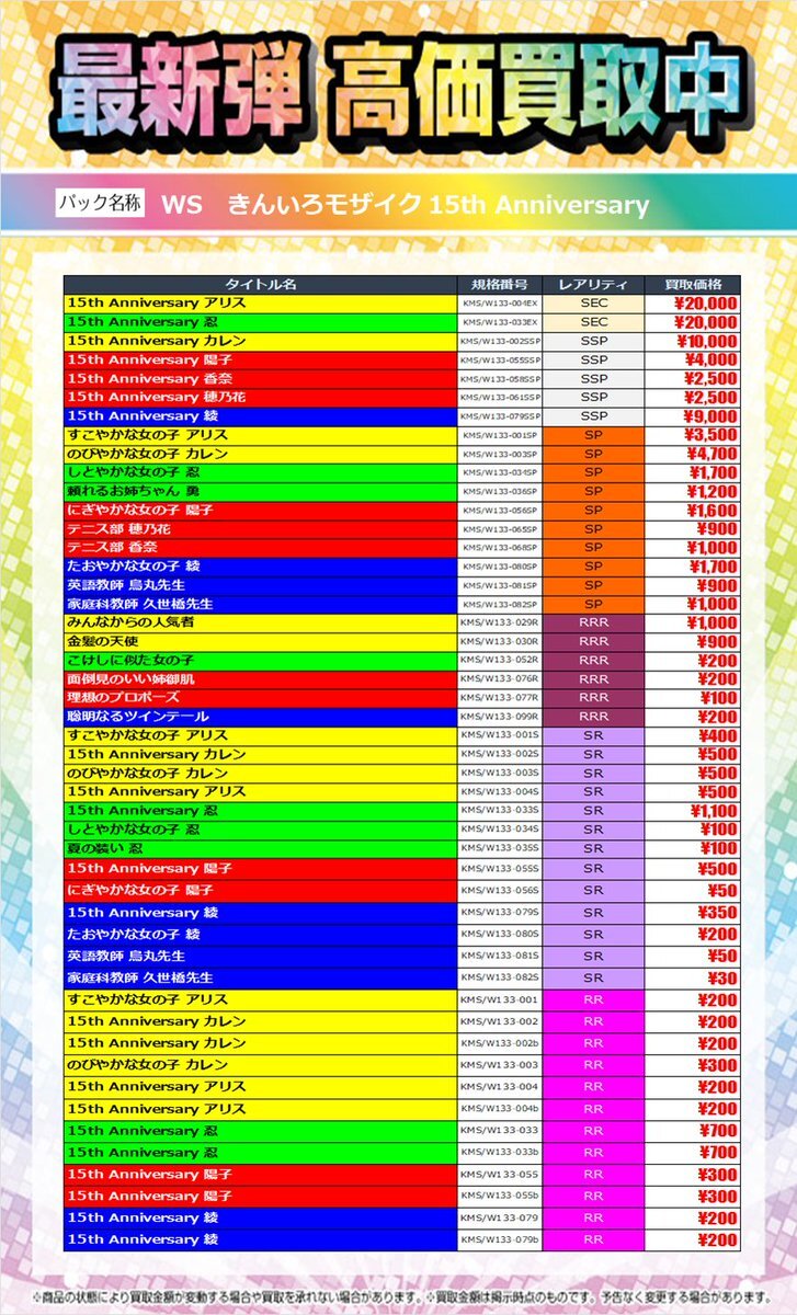~最新弾 高価買取情報~ 11月14日(金)発売 #ヴァイスシュヴァルツ ブースターパック 「きんいろモザイク 15th Anniversary」 11月14日(金)14時30分~の買取価格です✨ ご来店をお待ちしております🙇‍♀️ 在庫状況により価格変動がございます。 ご了承ください。 #TSUTAYA大垣店 pic.x.com/plIhYFwRF7