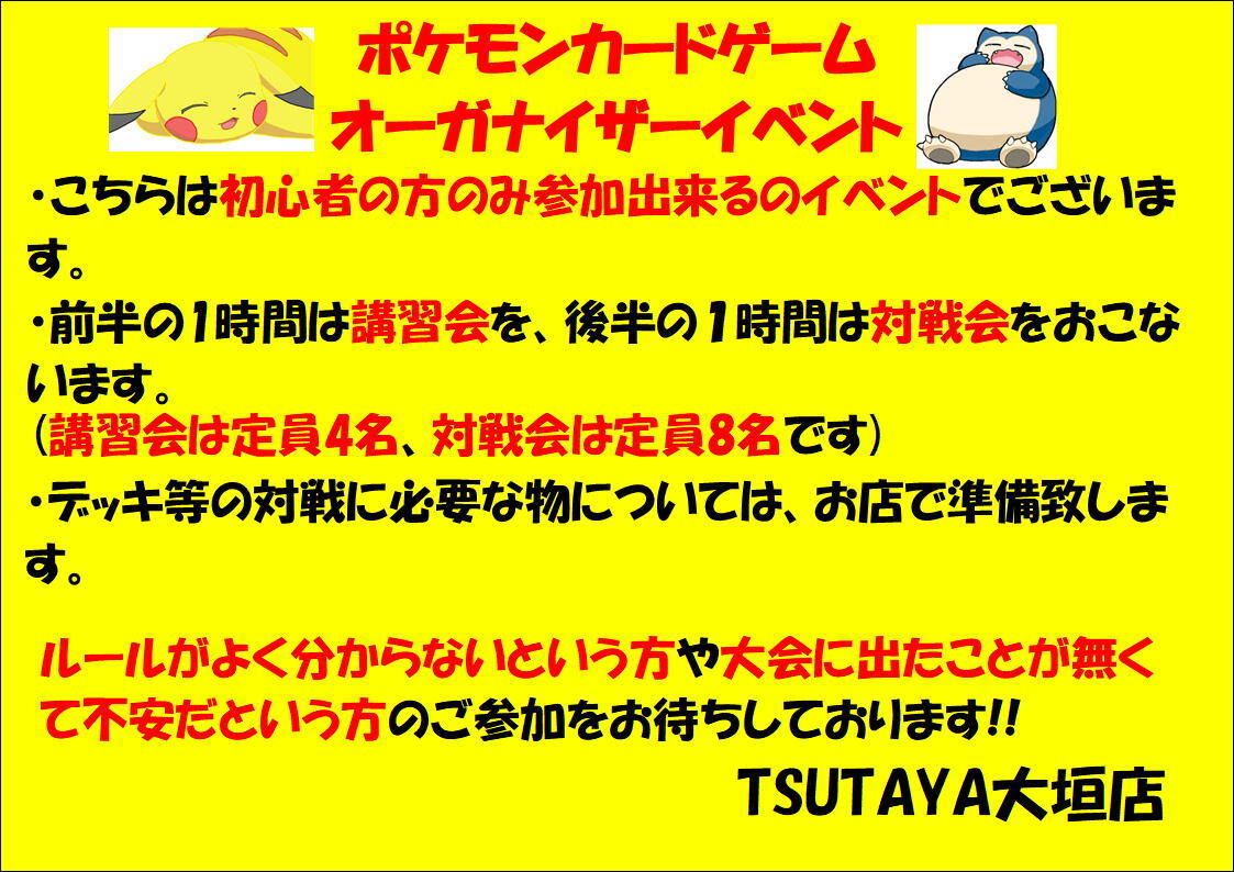〖本日のトレカ大会〗 本日14時より #ポケモンカード 初心者向け講習会を開催します🎉 ※大会開始30分前から、2階のデュエルスペースにてエントリーの受付を開始します。 #ポケモン #初心者向け講習会 #TSUTAYA大垣店 pic.x.com/JWRvpoUiFE