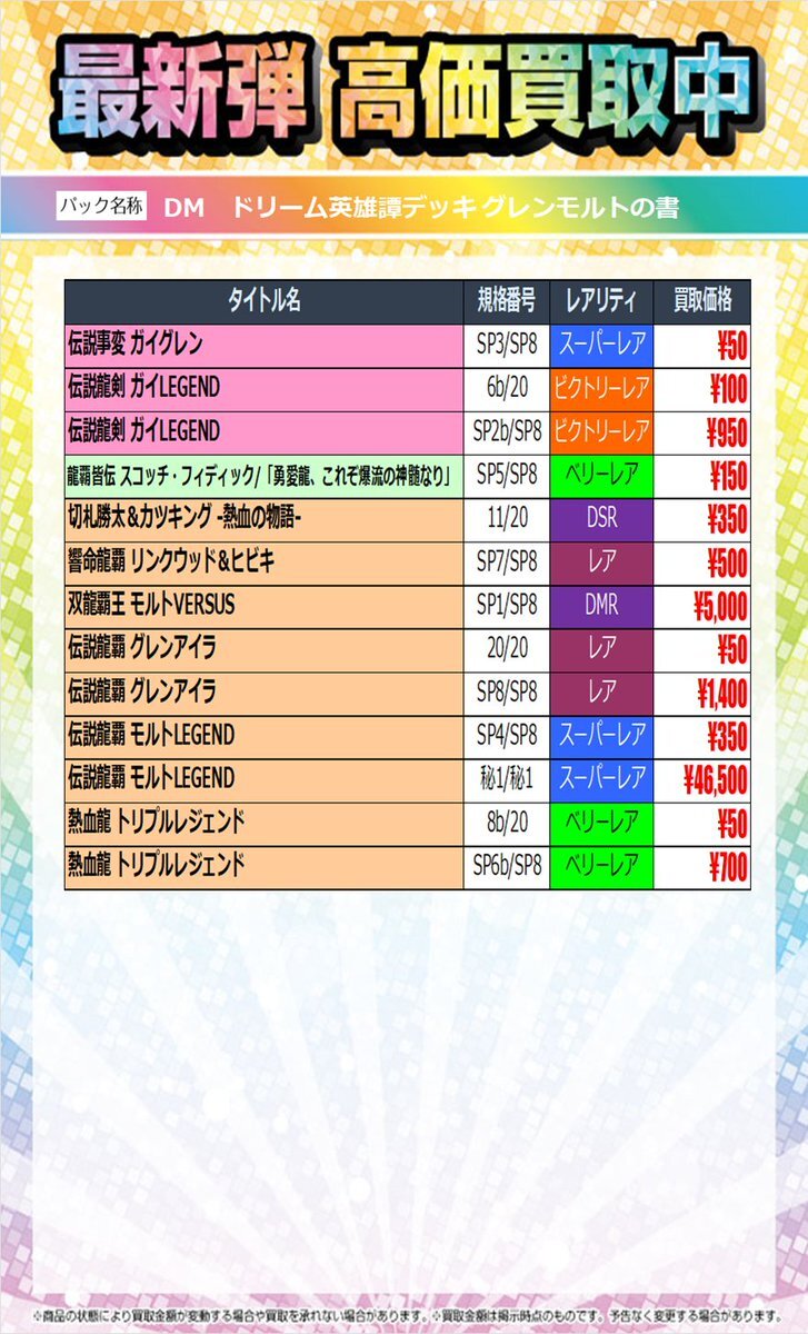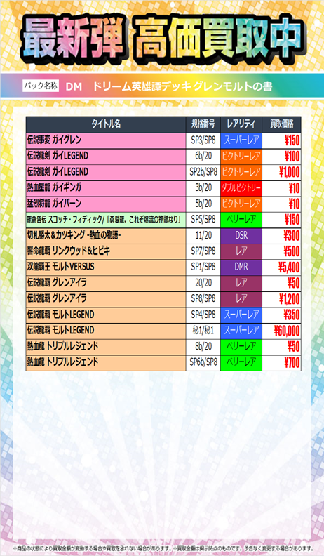 ~最新弾 高価買取情報~ 11月15日(土)発売 #デュエルマスターズ ドリーム英雄譚デッキ 「グレンモルトの書」 11月16日(日)13時00分~の買取価格です✨ ご来店をお待ちしております🙇‍♀️ 在庫状況により価格変動がございます。 ご了承ください。 #TSUTAYA大垣店 pic.x.com/uFpBV8d2wF