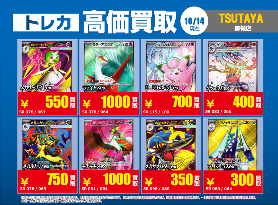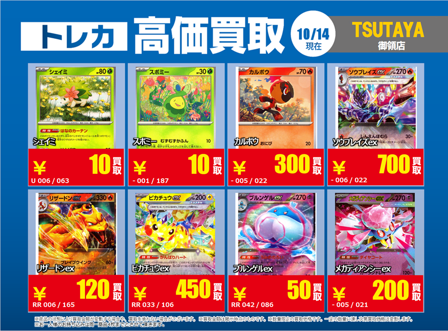 【御領店限定トレカ高価買取情報】 10/15~ #ポケモンカード 特別高価買取です。 ※規定枚数集まり次第終了 ※同名カードは4枚まで ※美品のみ対象 「Xの告知を見ました。」と伝えてください🤳 該当のカードを店頭にて仕分けお願い致します! ご来店お待ちしております! #ポケカ #トレカ #買取 #熊本