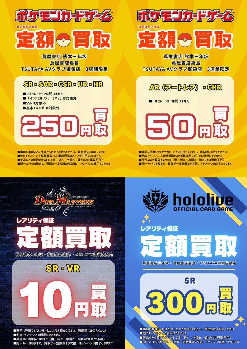 【買取情報】 本日も買取実施中! #ポケモンカードゲーム #デュエルマスターズ #ホロライブカードゲーム レアリティ保証実施中‼️ お持ち込みお待ちしております! #TSUTAYA御領店 pic.x.com/idp8xbMwzp