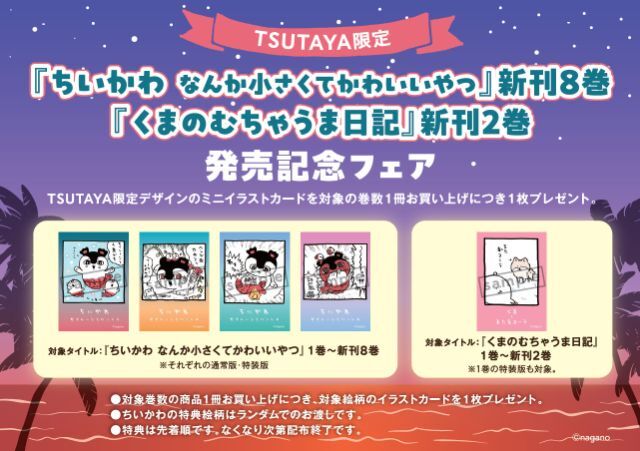 #TSUTAYA東福原店 BOOK新刊のお知らせ‼ 「#ちいかわ⑧ 通常版・特装版 #くまのむちゃうま日記②」予約受付中‼ 11/21(金)発売予定 シリーズ連動購入特典 ・ちいかわ①~⑧(通常版・特装版 (ミニイラストカード4種ランダム1枚) ・くまのむちゃうま日記①② (ミニイラストカード1種) #超コミツタ pic.x.com/T8uACe0Xop