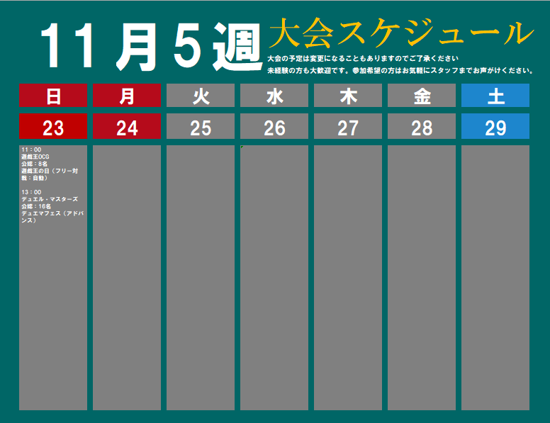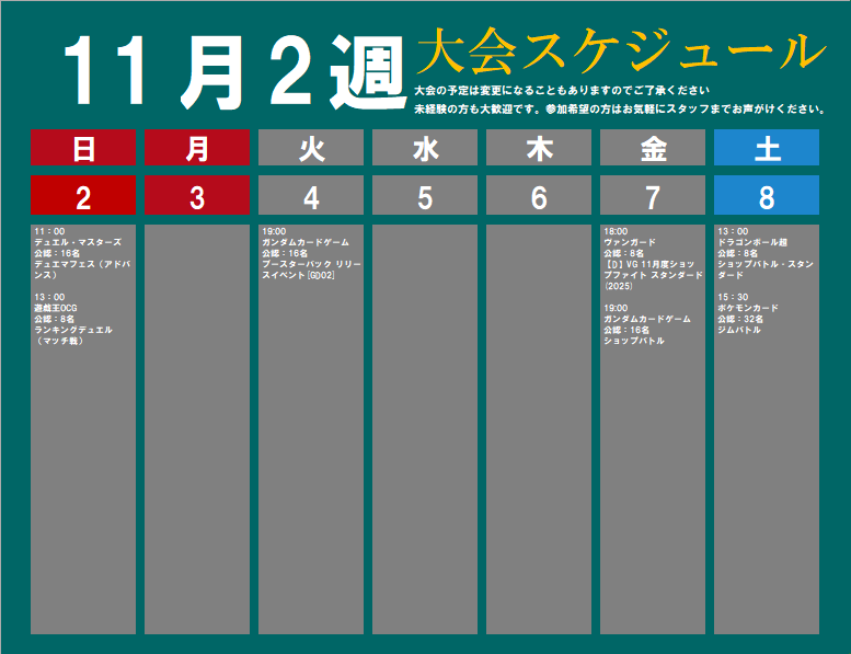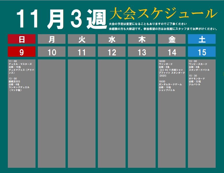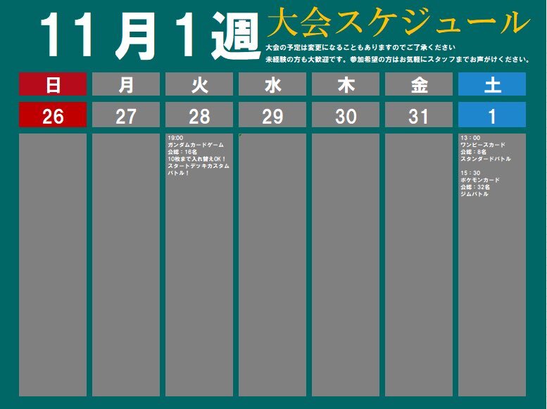 🔥🤜【大会情報】🤛🔥 11月の大会一覧です。 参加者・上位者には景品のお渡しを予定しています✨ ぜひご参加下さい😎 ※大会の予定・内容は変更になることもありますのでご了承ください #TSUTAYA東福原店 #カード大会 pic.x.com/je9IqH0bYX