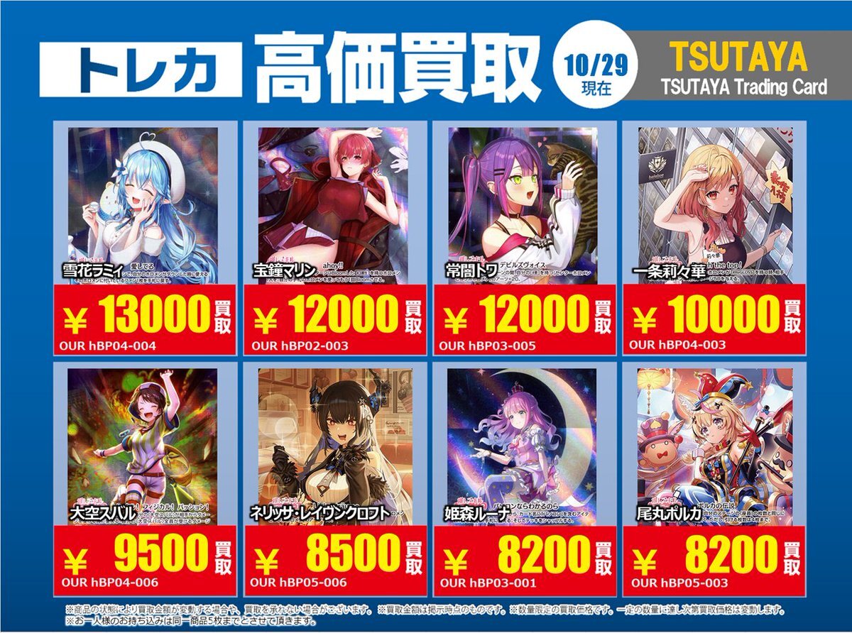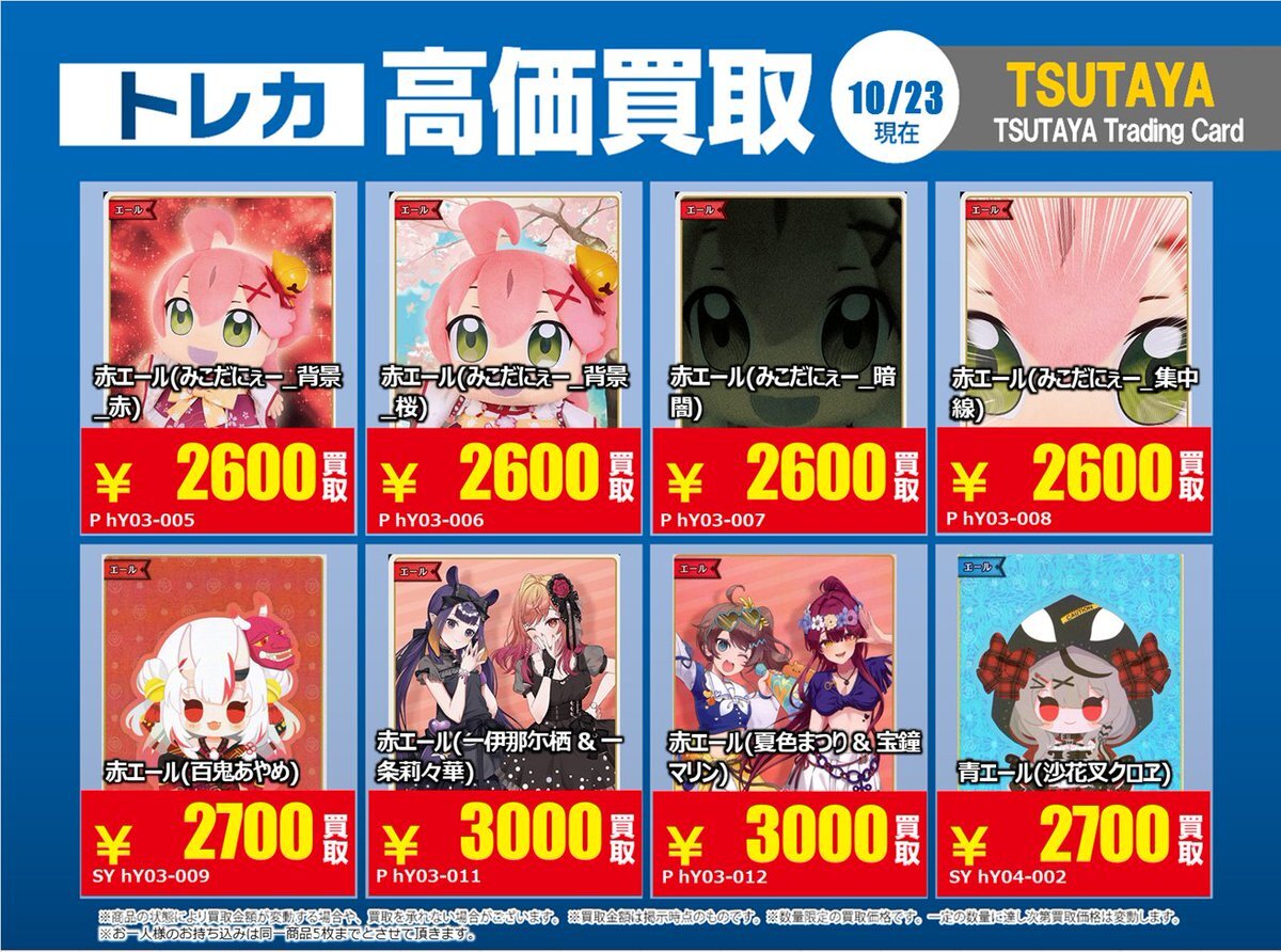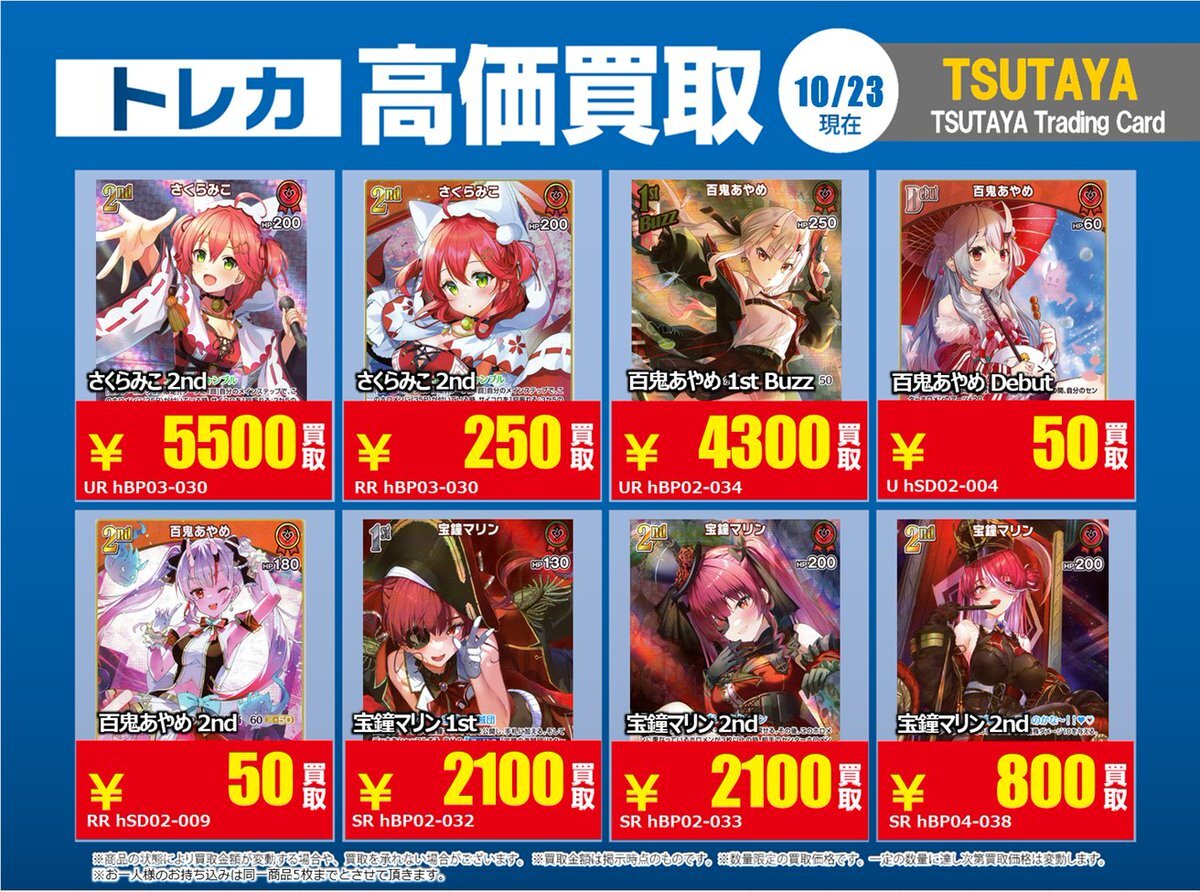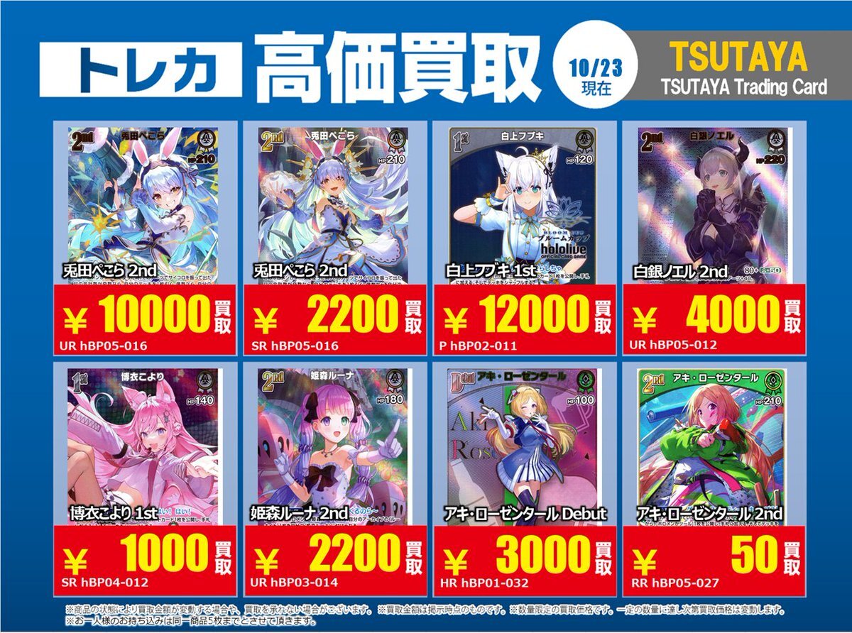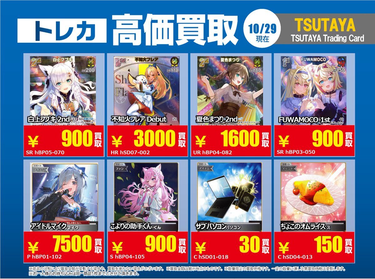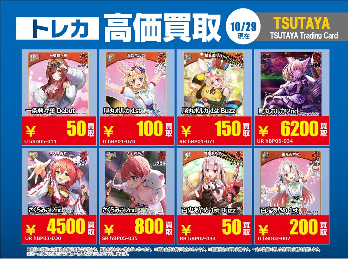 【高価買取情報】 11/4まで #hololive ① 高価買取商品をお持ち頂く場合は レジにてX掲載カードと必ずお伝え下さい。 申告が無い場合は通常価格での買取 となってしまいますのでお気を付け下さい ※在庫状況や商品状態で買取価格が変動 または終了する事がございます #TTC錦糸町店 pic.x.com/84eMYYilh6