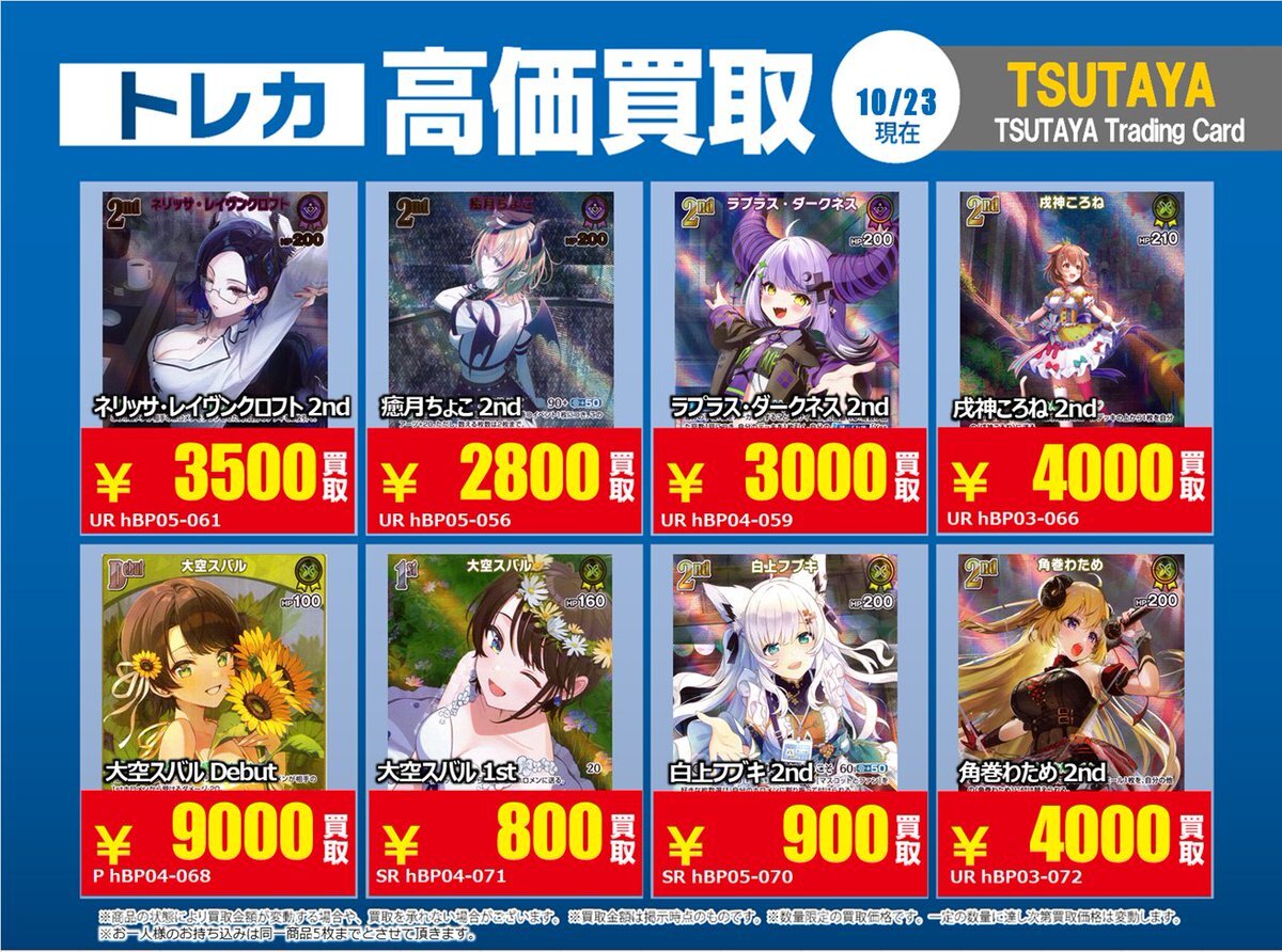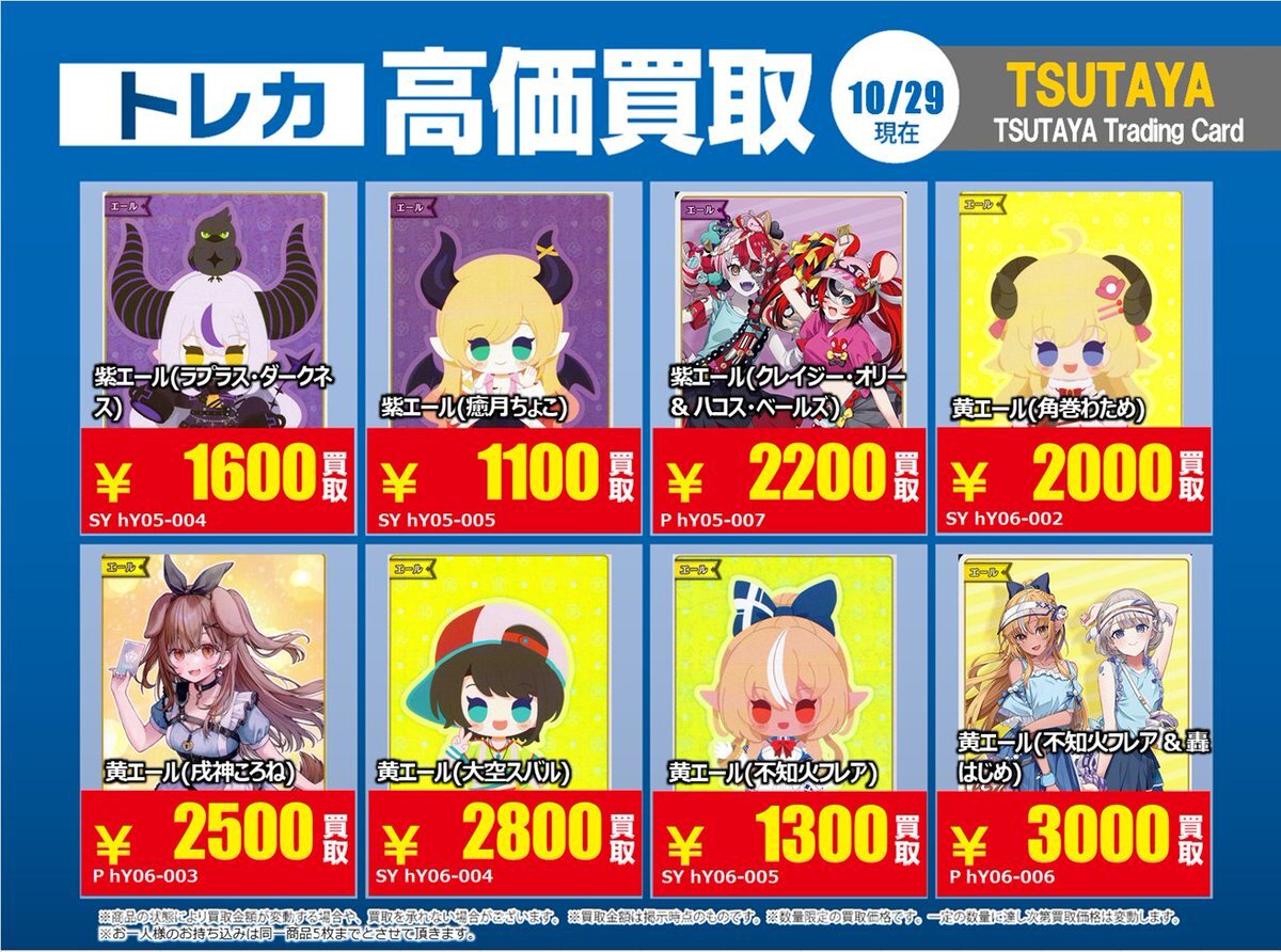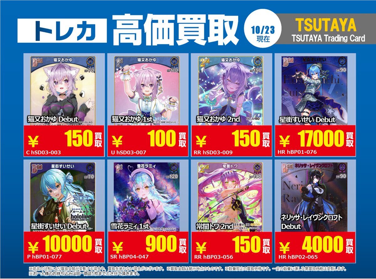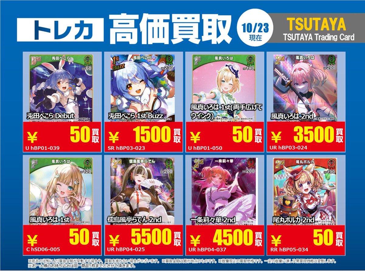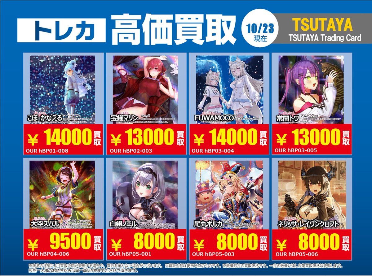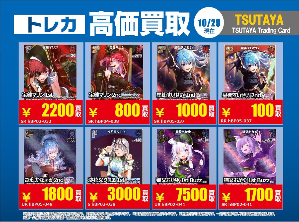 【高価買取情報】 11/4まで #hololive ① 高価買取商品をお持ち頂く場合は レジにてX掲載カードと必ずお伝え下さい。 申告が無い場合は通常価格での買取 となってしまいますのでお気を付け下さい ※在庫状況や商品状態で買取価格が変動 または終了する事がございます #TTC錦糸町店 pic.x.com/84eMYYilh6