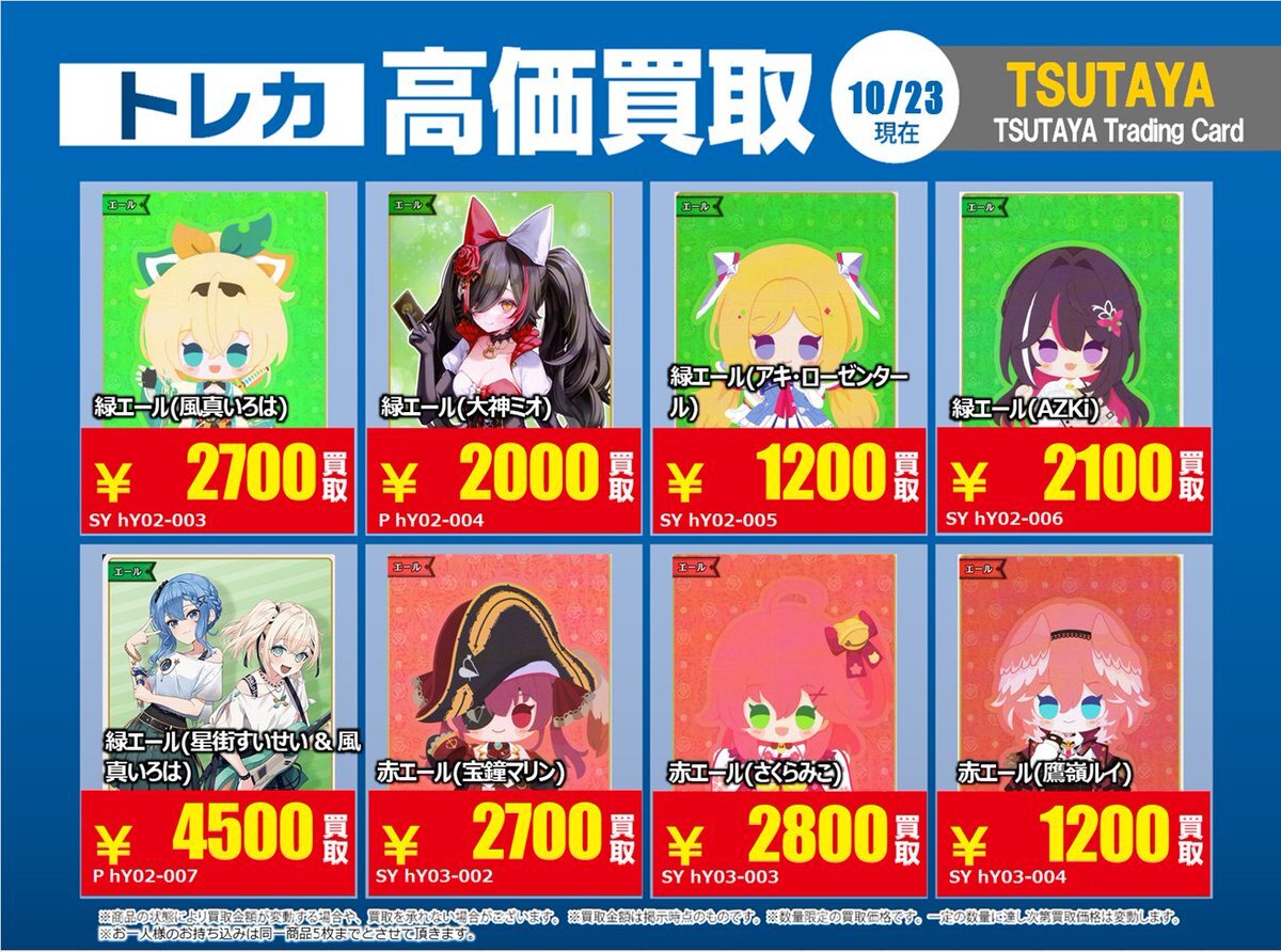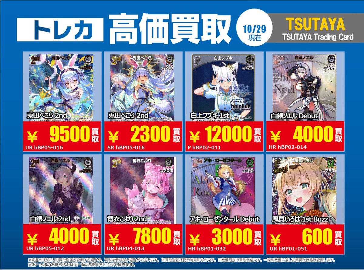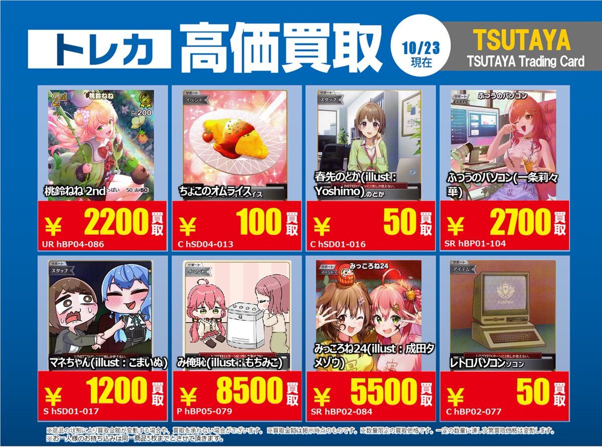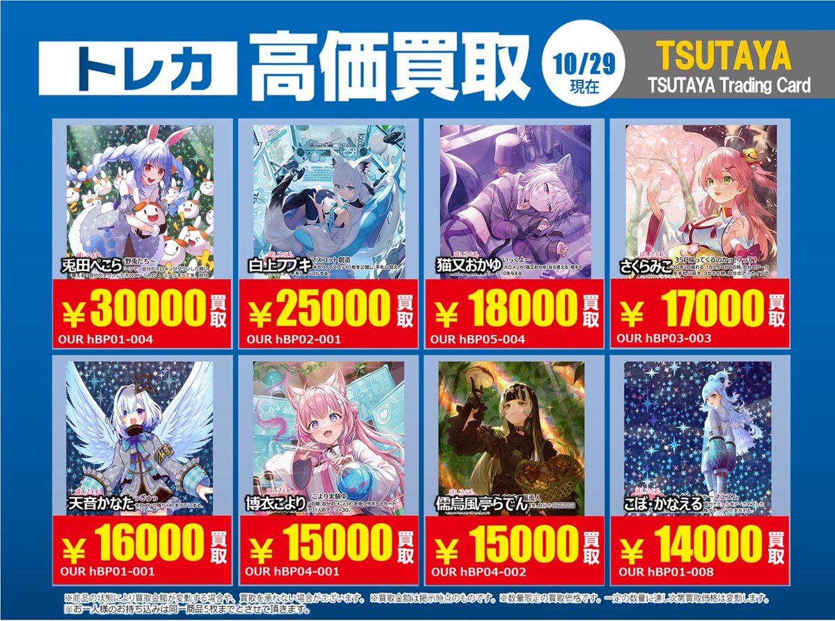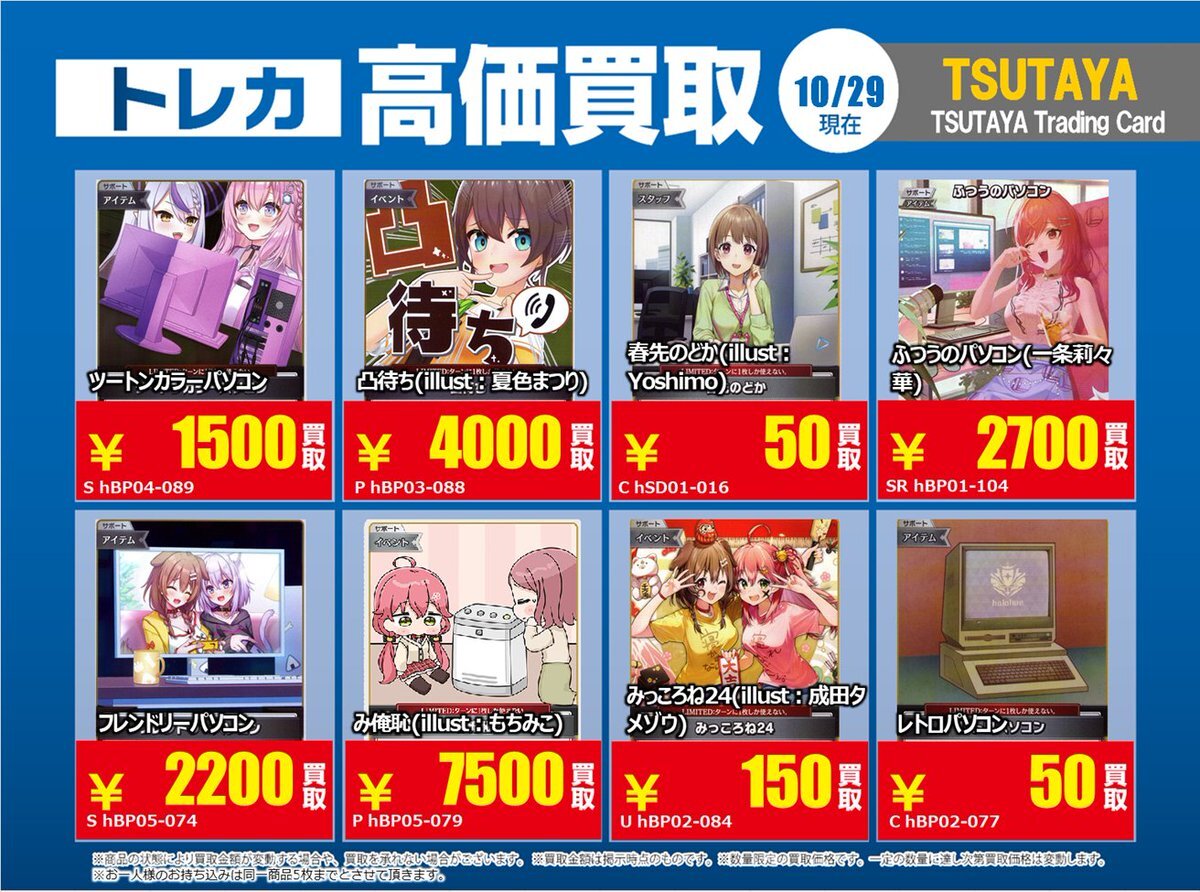 【高価買取情報】 11/4まで #hololive ① 高価買取商品をお持ち頂く場合は レジにてX掲載カードと必ずお伝え下さい。 申告が無い場合は通常価格での買取 となってしまいますのでお気を付け下さい ※在庫状況や商品状態で買取価格が変動 または終了する事がございます #TTC錦糸町店 pic.x.com/84eMYYilh6