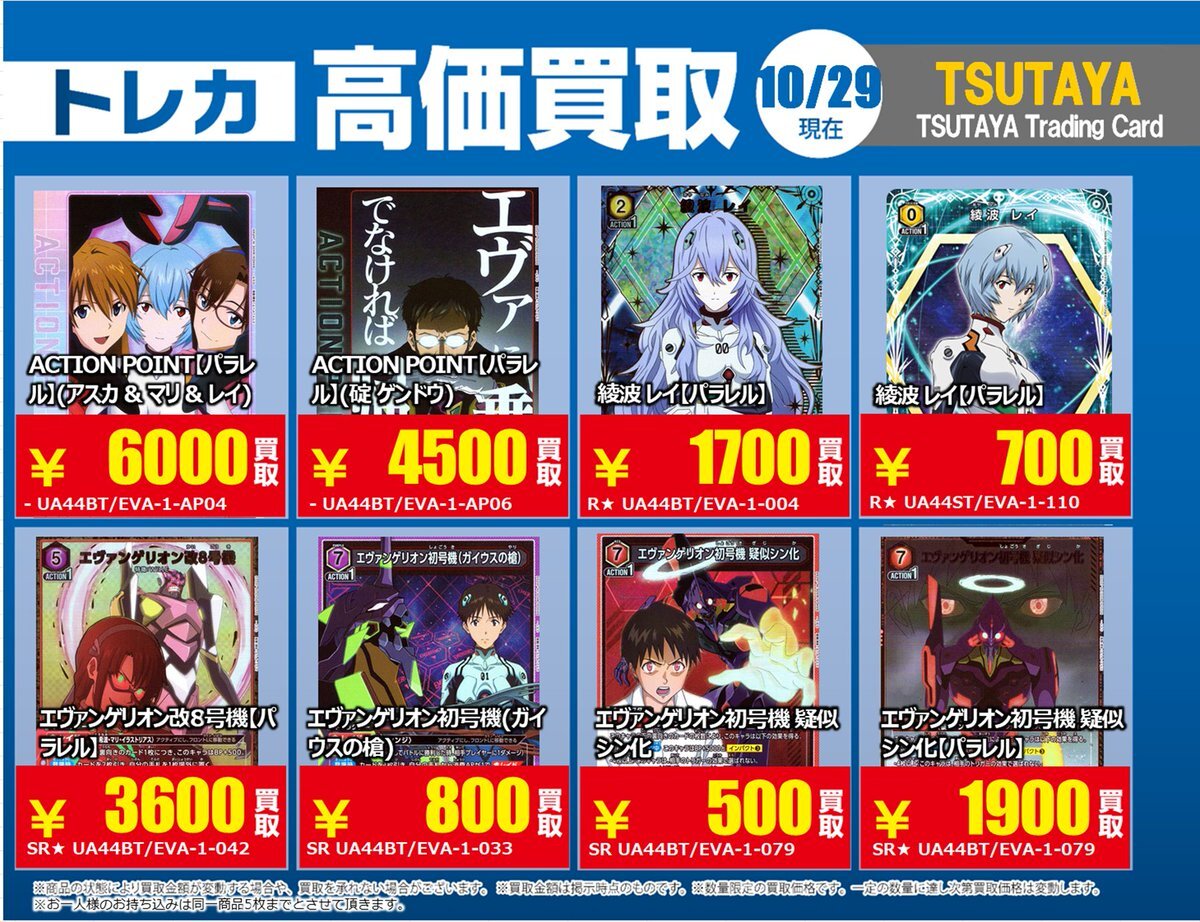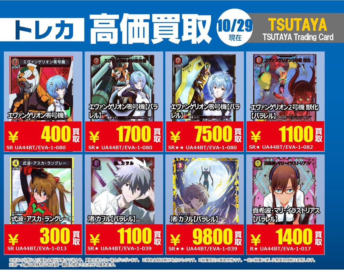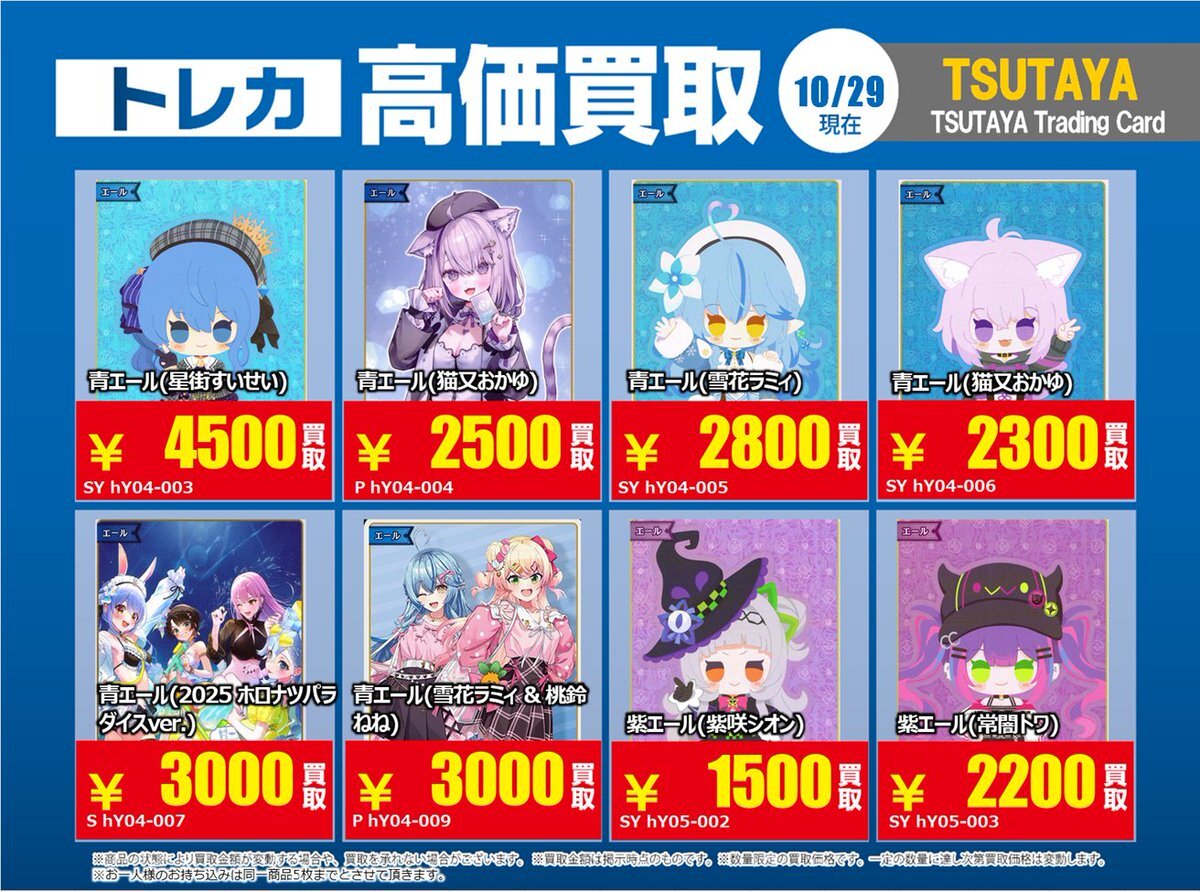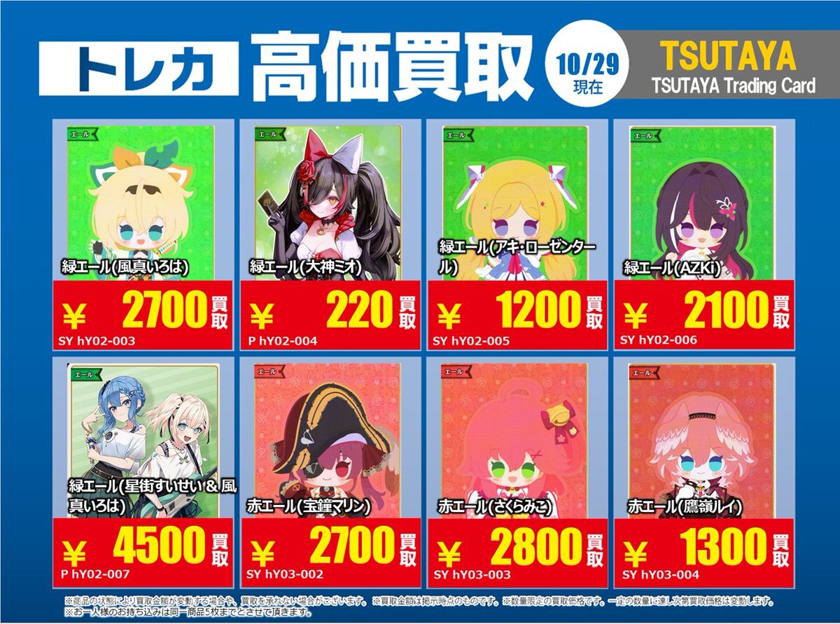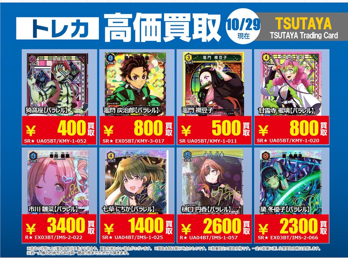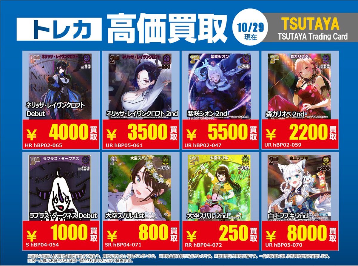 【高価買取情報】 11/4まで #hololive ① 高価買取商品をお持ち頂く場合は レジにてX掲載カードと必ずお伝え下さい。 申告が無い場合は通常価格での買取 となってしまいますのでお気を付け下さい ※在庫状況や商品状態で買取価格が変動 または終了する事がございます #TTC錦糸町店 pic.x.com/84eMYYilh6