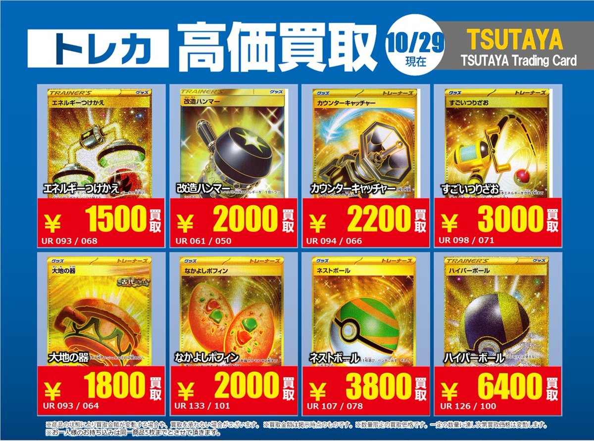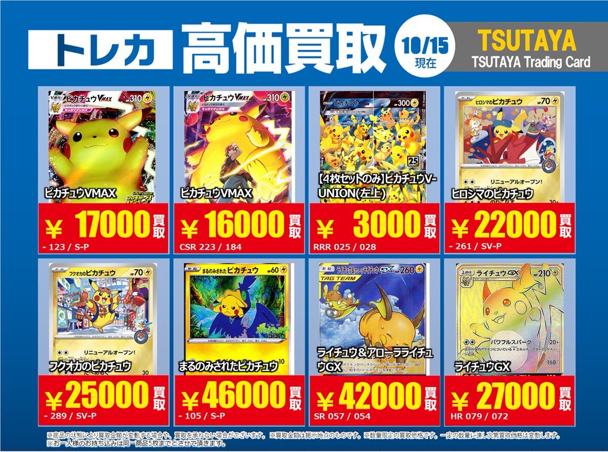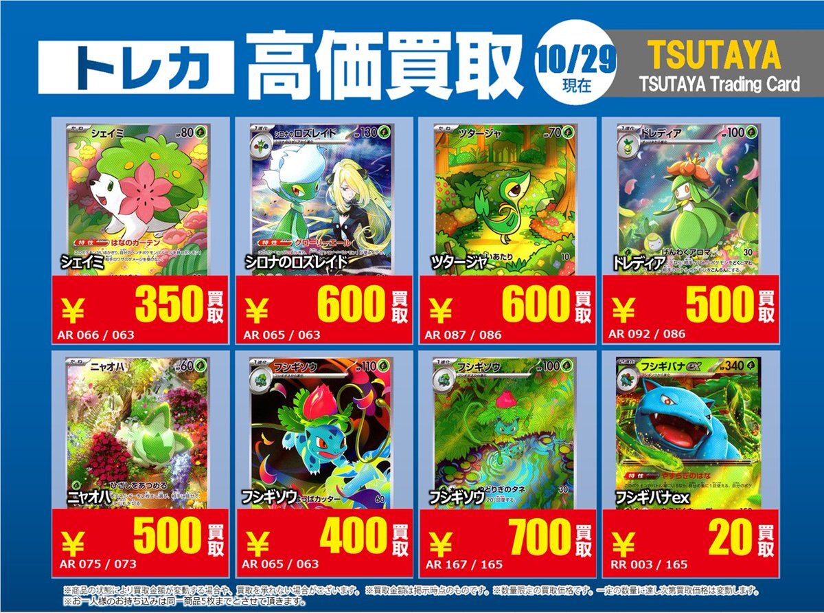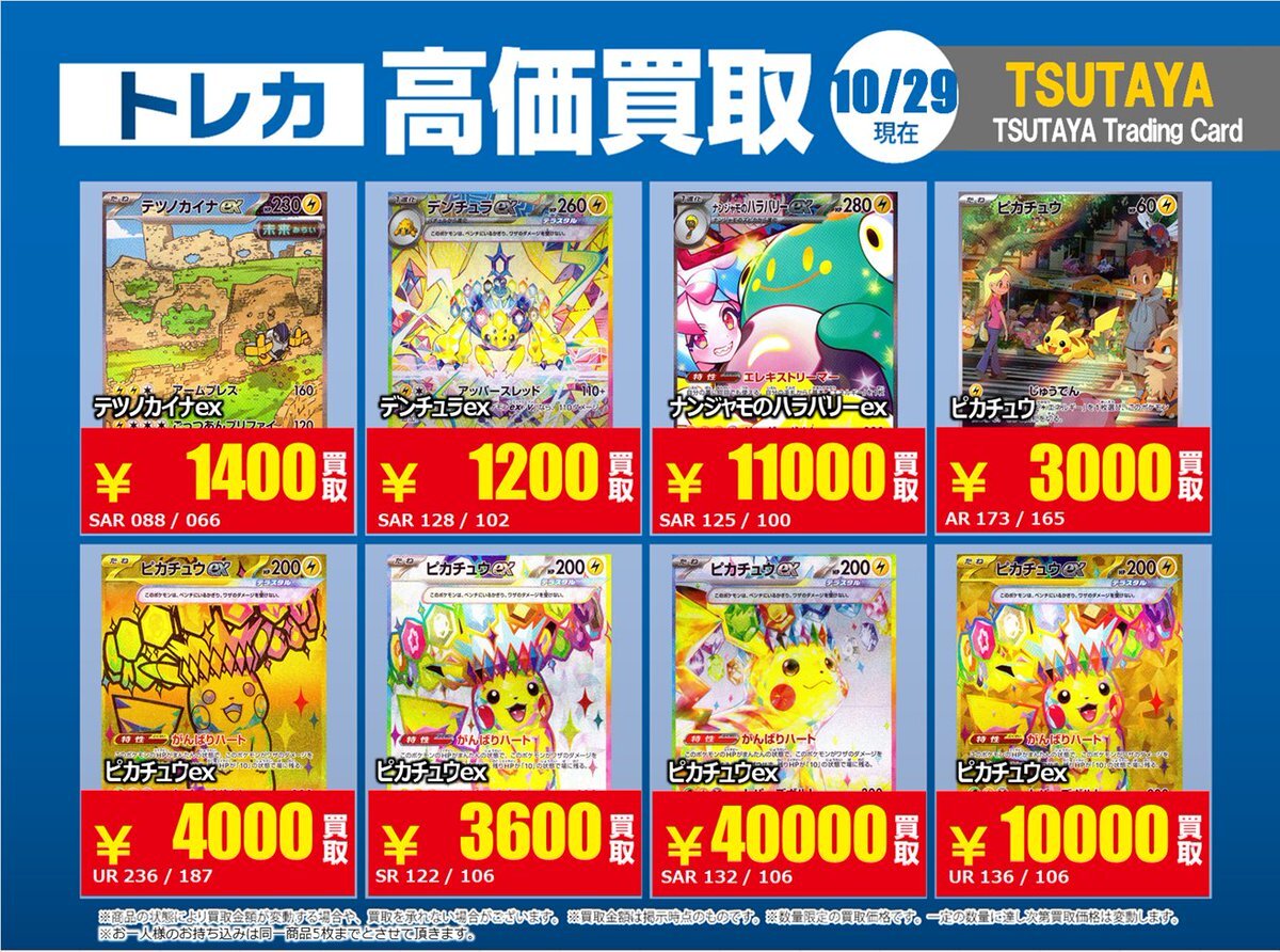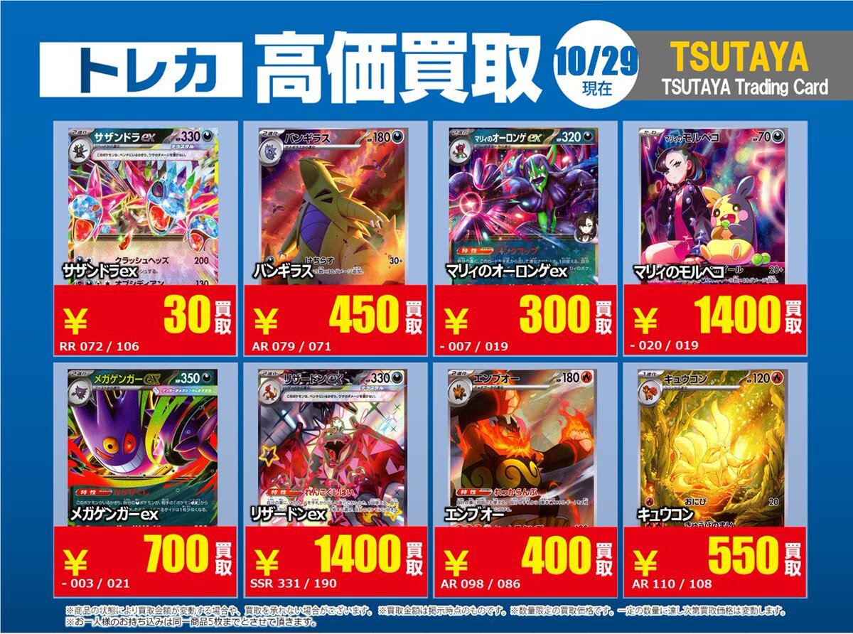 【高価買取情報】 10/28まで #ポケモンカード #エクストラ ④ 高価買取商品をお持ち頂く場合は レジにてX掲載カードと必ずお伝え下さい。 申告が無い場合は通常価格での買取 となってしまいますのでお気を付け下さい ※在庫状況や商品状態で買取価格が変動 または終了する事がございます #TTC錦糸町店 pic.x.com/hzu0DTdtNA