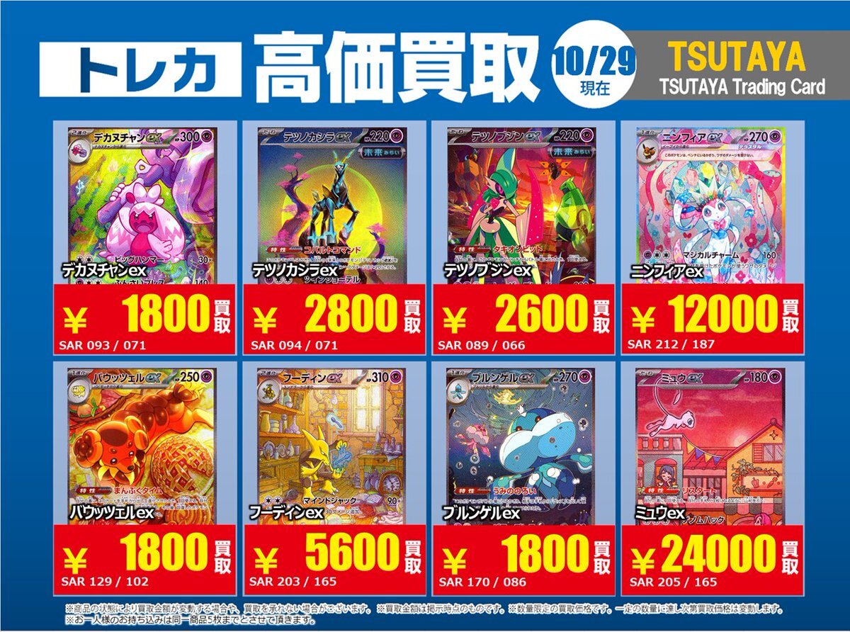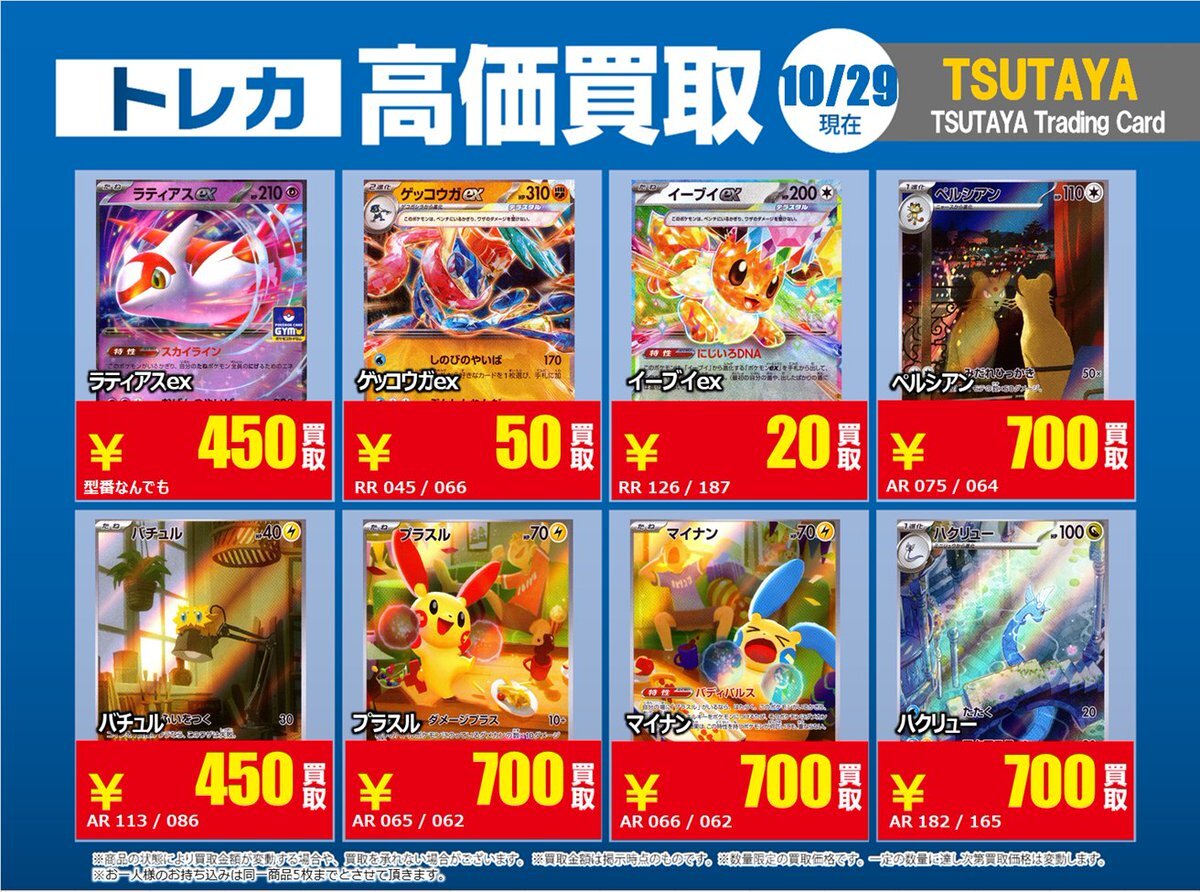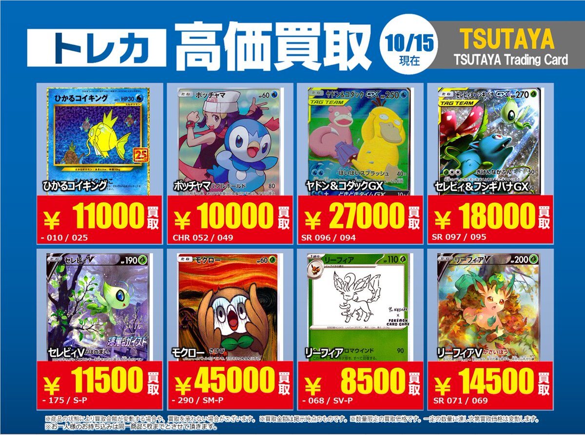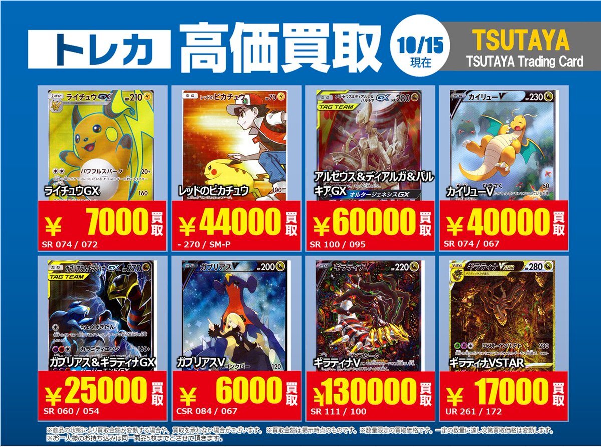 【高価買取情報】 10/28まで #ポケモンカード #エクストラ ④ 高価買取商品をお持ち頂く場合は レジにてX掲載カードと必ずお伝え下さい。 申告が無い場合は通常価格での買取 となってしまいますのでお気を付け下さい ※在庫状況や商品状態で買取価格が変動 または終了する事がございます #TTC錦糸町店 pic.x.com/hzu0DTdtNA