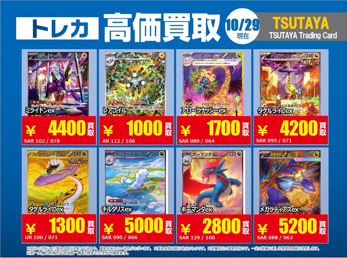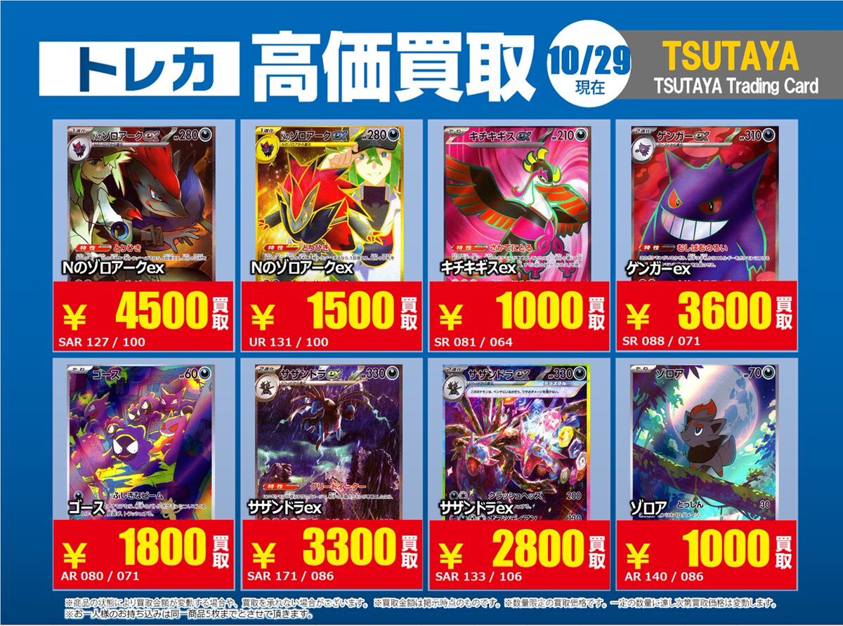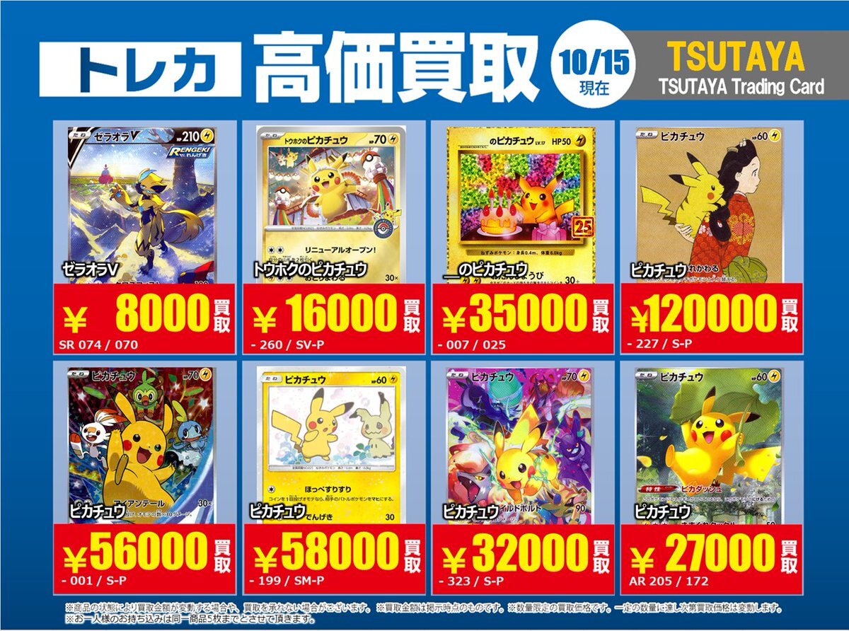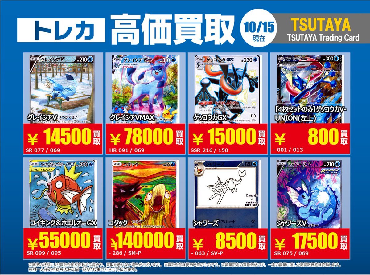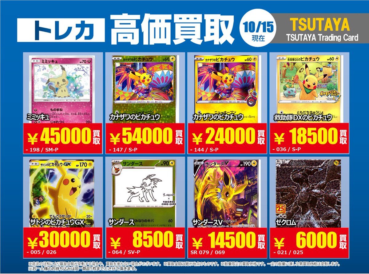 【高価買取情報】 10/28まで #ポケモンカード #エクストラ ④ 高価買取商品をお持ち頂く場合は レジにてX掲載カードと必ずお伝え下さい。 申告が無い場合は通常価格での買取 となってしまいますのでお気を付け下さい ※在庫状況や商品状態で買取価格が変動 または終了する事がございます #TTC錦糸町店 pic.x.com/hzu0DTdtNA
