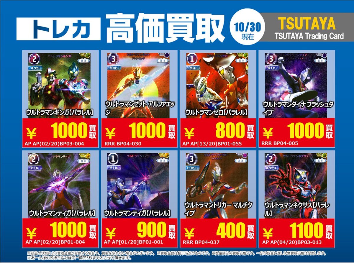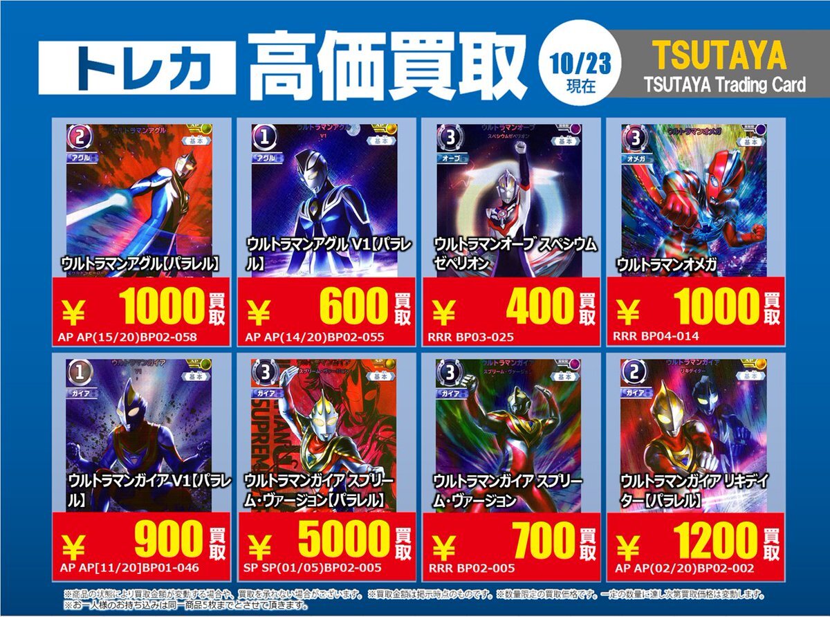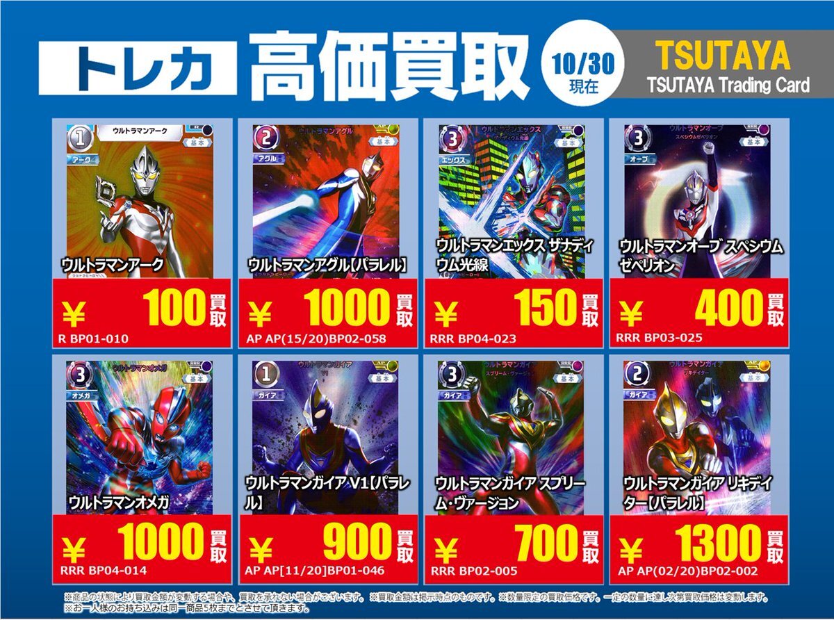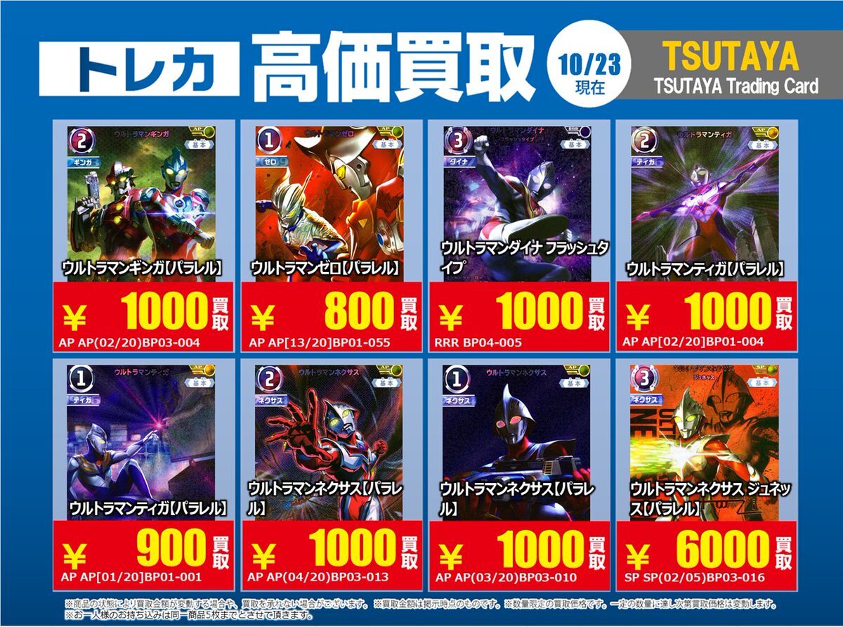 【高価買取情報】 10/28まで #ウルトラマンカードゲーム 高価買取商品をお持ち頂く場合は レジにてX掲載カードと必ずお伝え下さい。 申告が無い場合は通常価格での買取 となってしまいますのでお気を付け下さい ※在庫状況や商品状態で買取価格が変動 または終了する事がございます #TTC錦糸町店 pic.x.com/mKJkFWBTUd