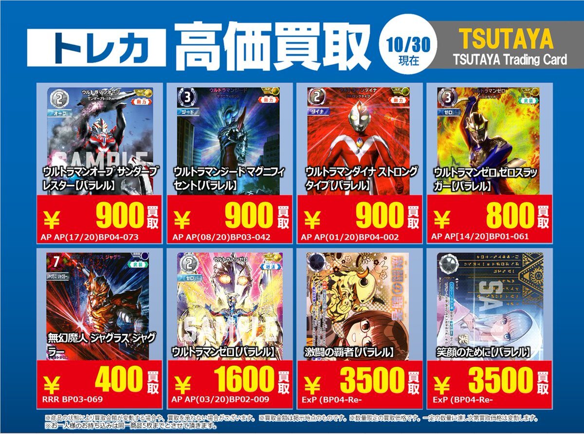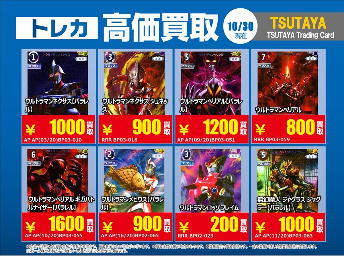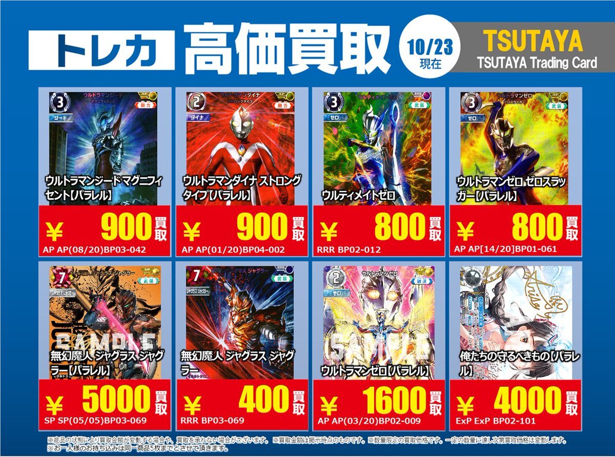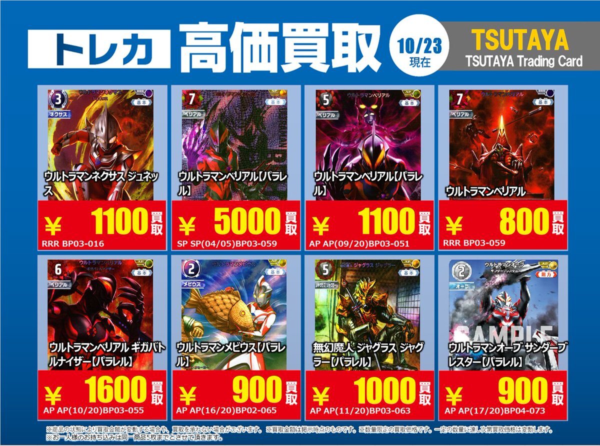 【高価買取情報】 10/28まで #ウルトラマンカードゲーム 高価買取商品をお持ち頂く場合は レジにてX掲載カードと必ずお伝え下さい。 申告が無い場合は通常価格での買取 となってしまいますのでお気を付け下さい ※在庫状況や商品状態で買取価格が変動 または終了する事がございます #TTC錦糸町店 pic.x.com/mKJkFWBTUd