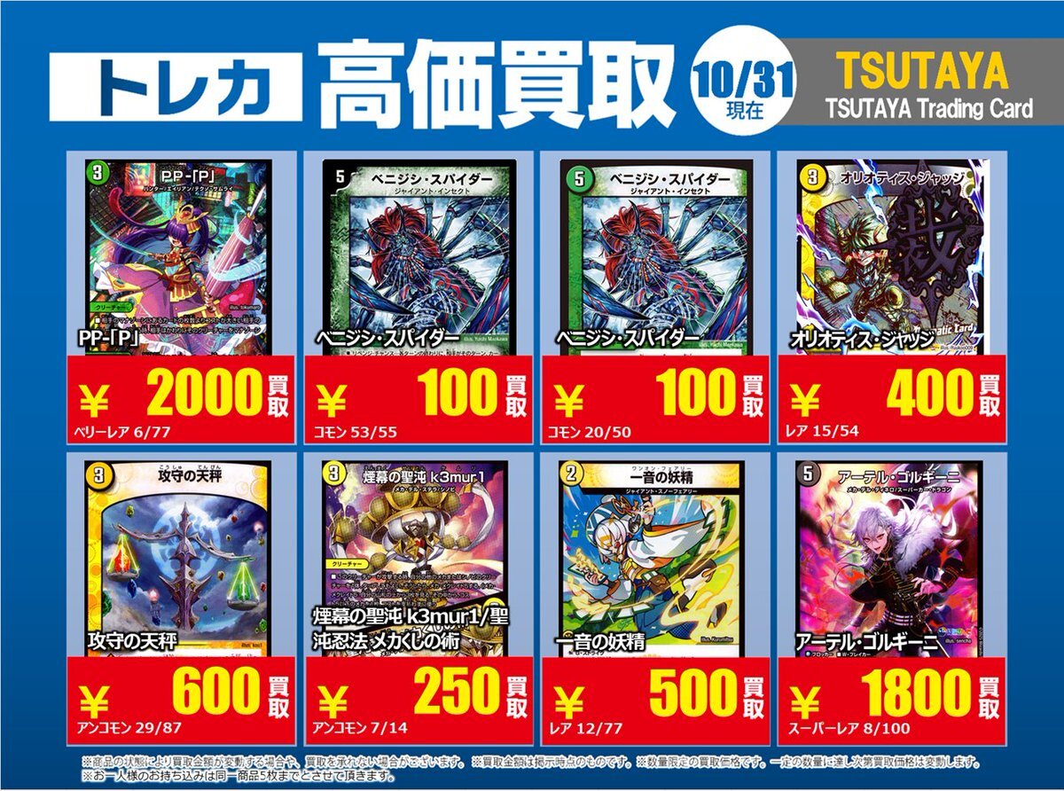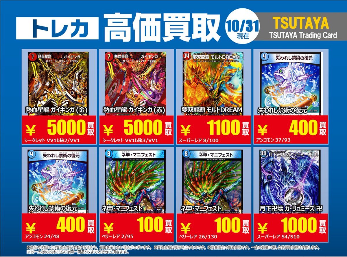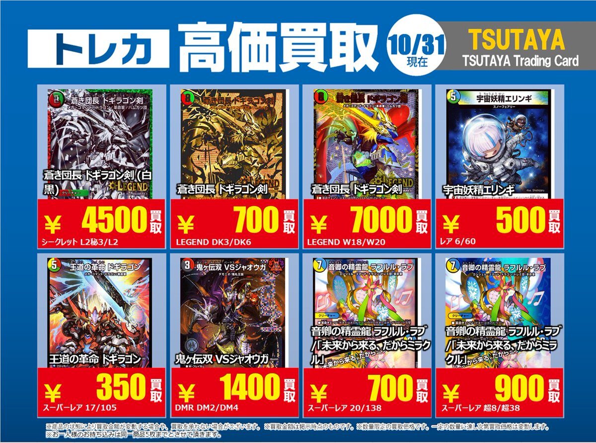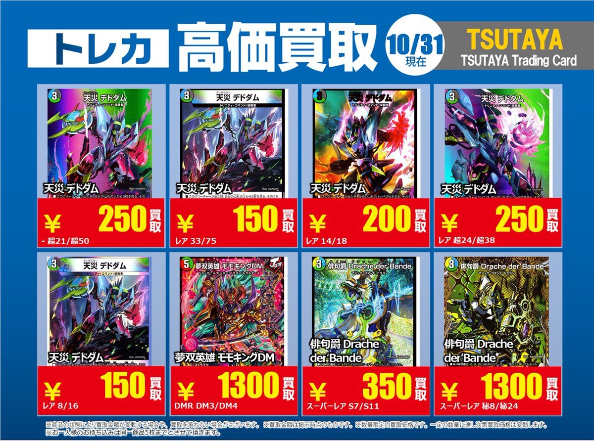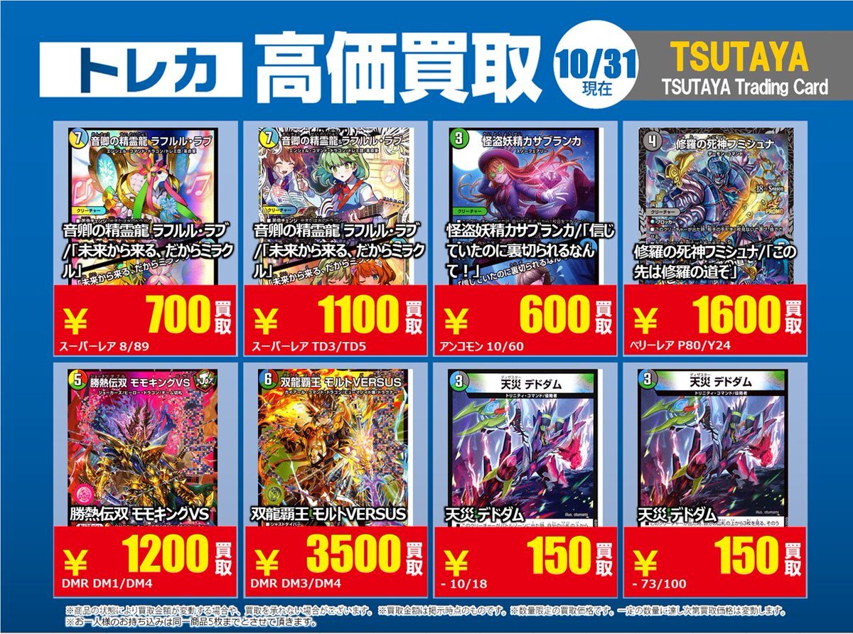 【高価買取情報】 11/4まで #デュエルマスターズ ① 高価買取商品をお持ち頂く場合は レジにてX掲載カードと必ずお伝え下さい。 申告が無い場合は通常価格での買取 となってしまいますのでお気を付け下さい。 ※在庫状況や商品状態で買取価格が変動 または終了する事がございます #TTC錦糸町店 pic.x.com/IKHrbxumI8