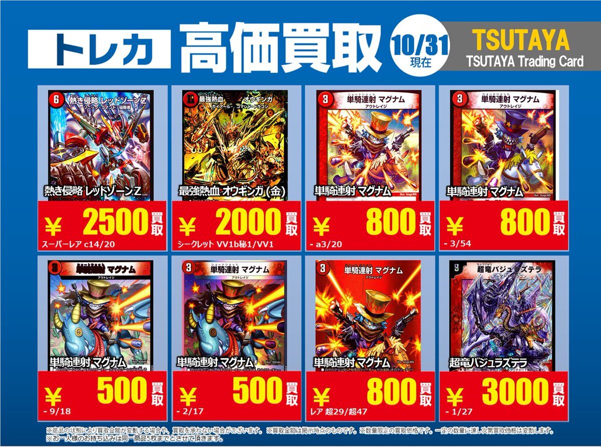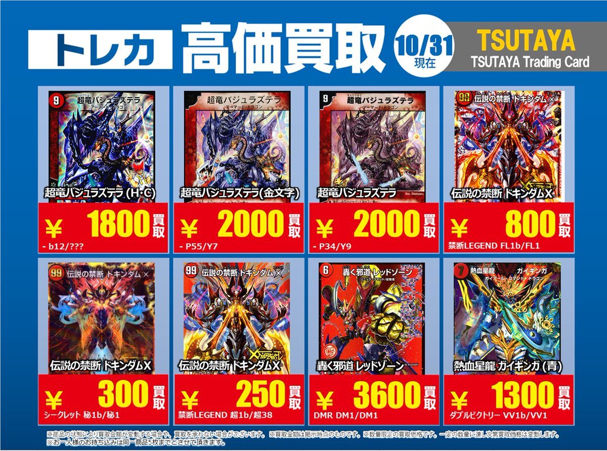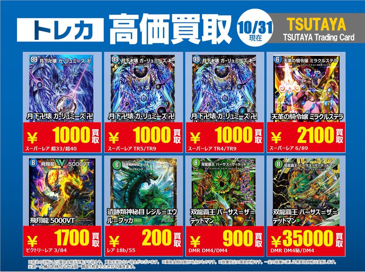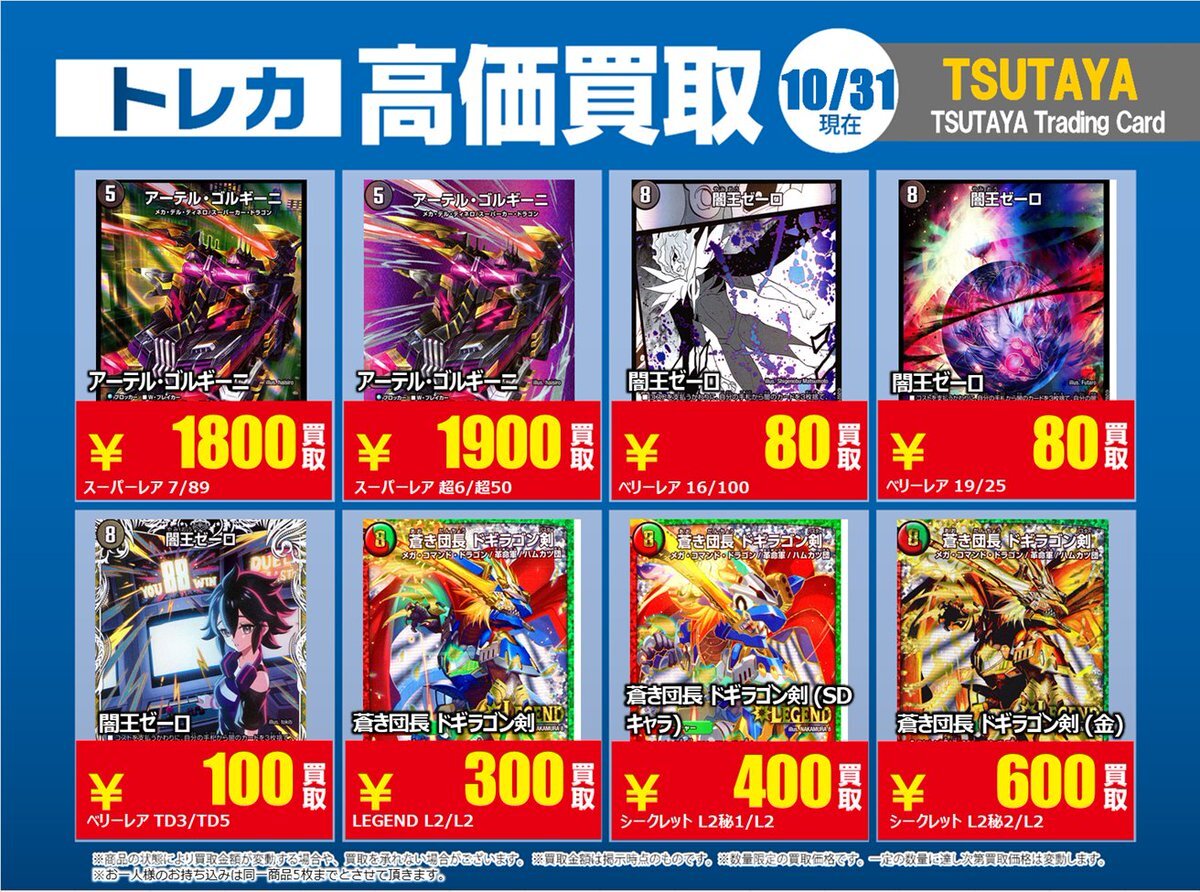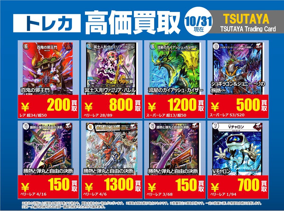 【高価買取情報】 11/4まで #デュエルマスターズ ① 高価買取商品をお持ち頂く場合は レジにてX掲載カードと必ずお伝え下さい。 申告が無い場合は通常価格での買取 となってしまいますのでお気を付け下さい。 ※在庫状況や商品状態で買取価格が変動 または終了する事がございます #TTC錦糸町店 pic.x.com/IKHrbxumI8