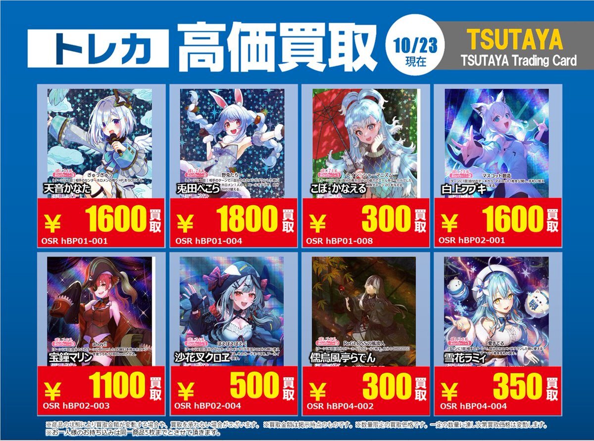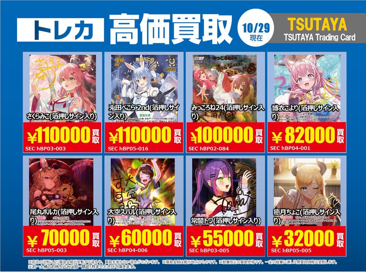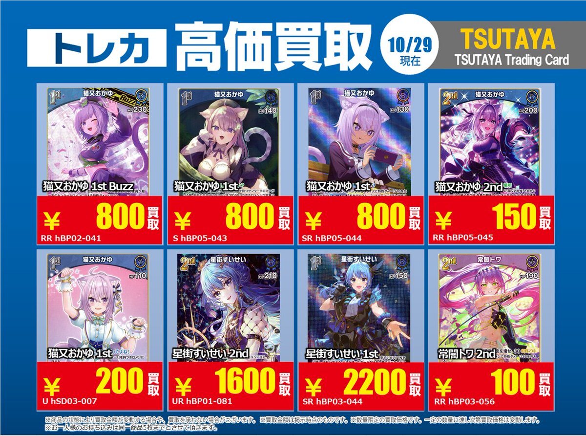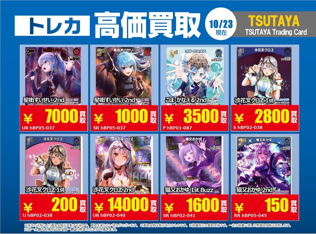 【高価買取情報】 10/28まで #hololive ① 高価買取商品をお持ち頂く場合は レジにてX掲載カードと必ずお伝え下さい。 申告が無い場合は通常価格での買取 となってしまいますのでお気を付け下さい ※在庫状況や商品状態で買取価格が変動 または終了する事がございます #TTC錦糸町店 pic.x.com/z6aSzxoAHC