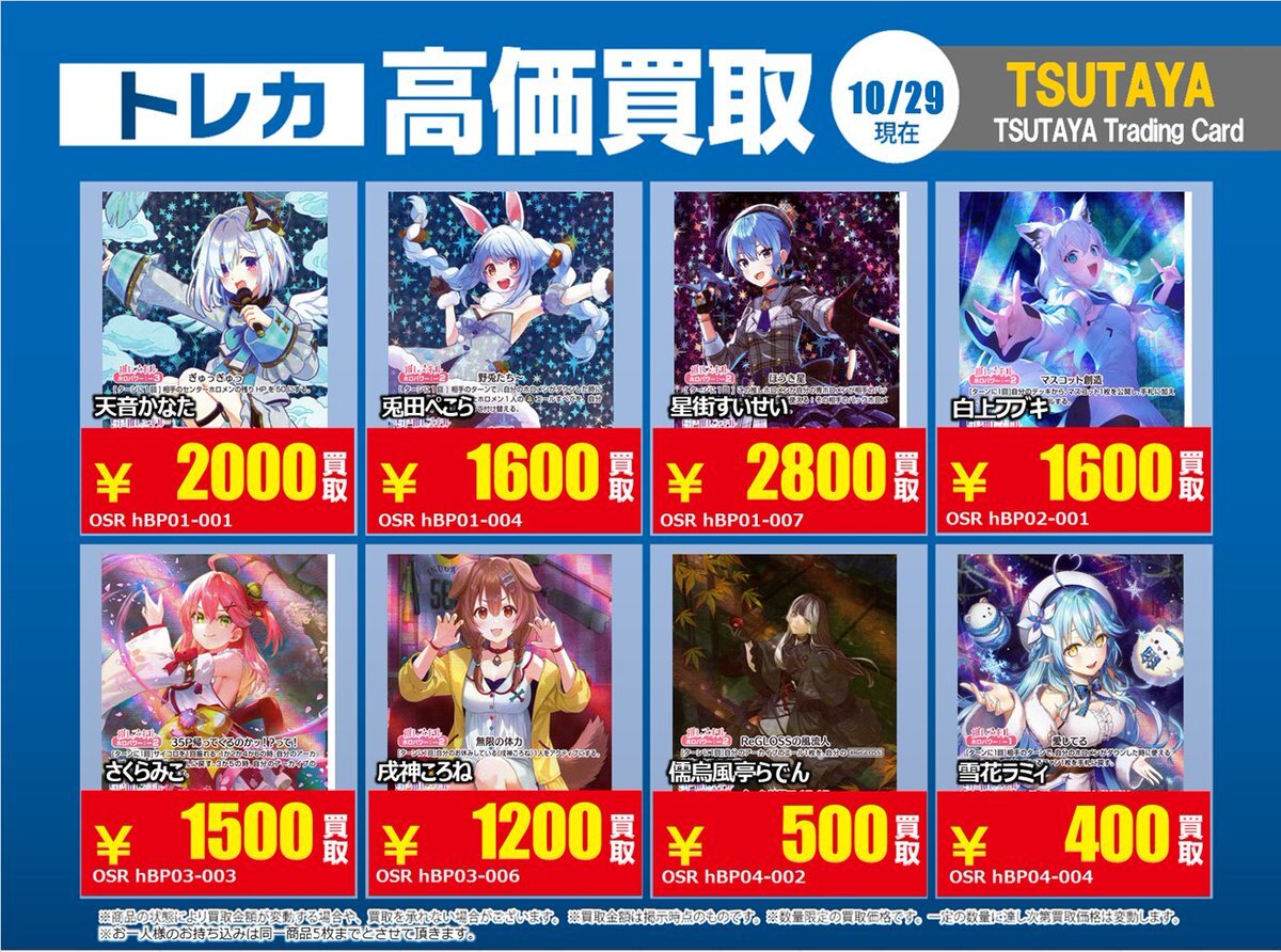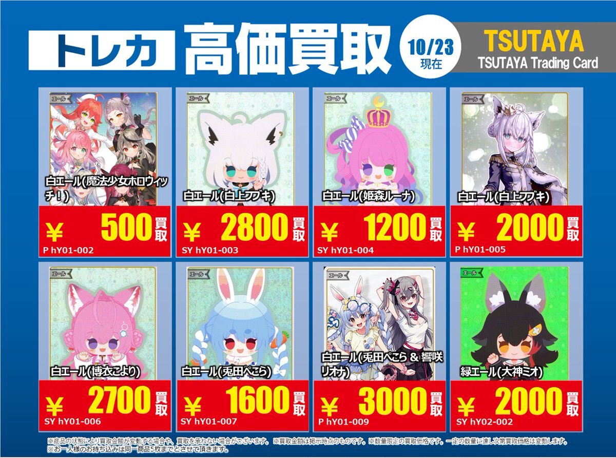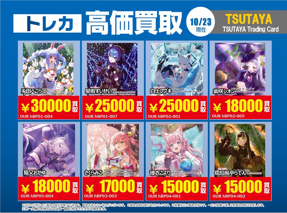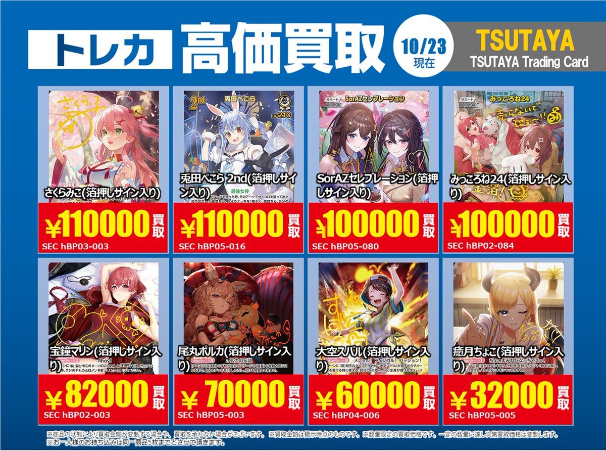 【高価買取情報】 10/28まで #hololive ① 高価買取商品をお持ち頂く場合は レジにてX掲載カードと必ずお伝え下さい。 申告が無い場合は通常価格での買取 となってしまいますのでお気を付け下さい ※在庫状況や商品状態で買取価格が変動 または終了する事がございます #TTC錦糸町店 pic.x.com/z6aSzxoAHC