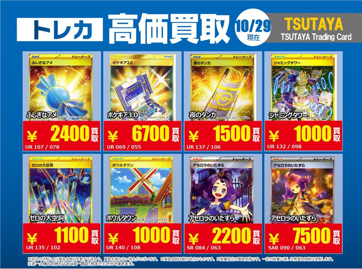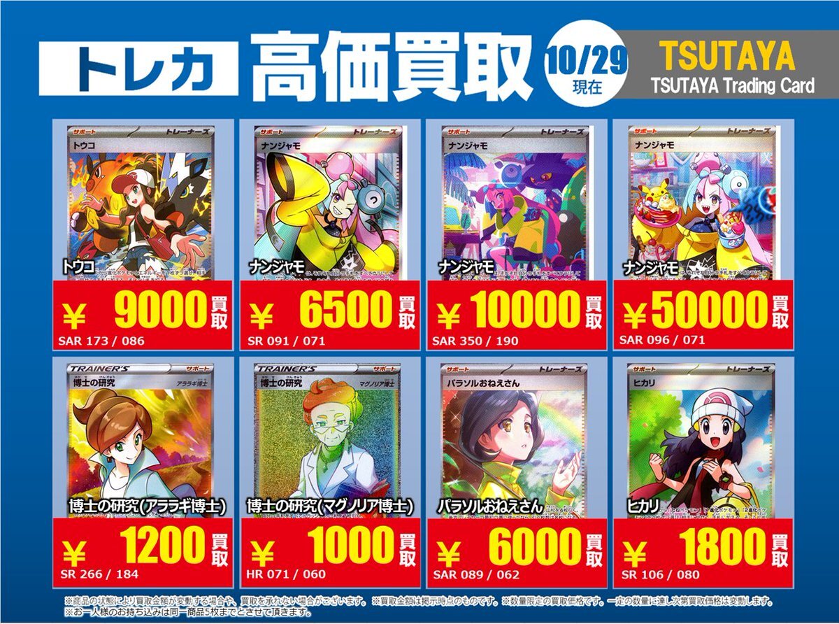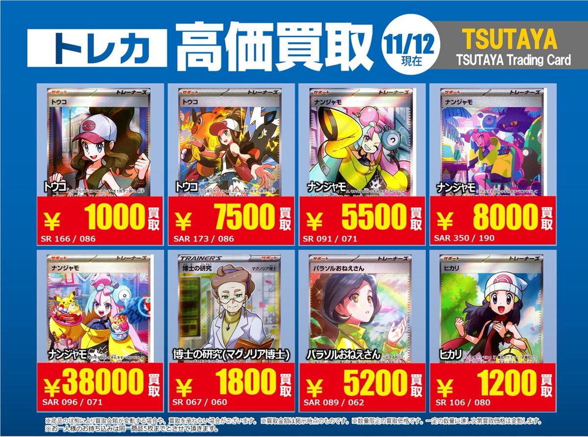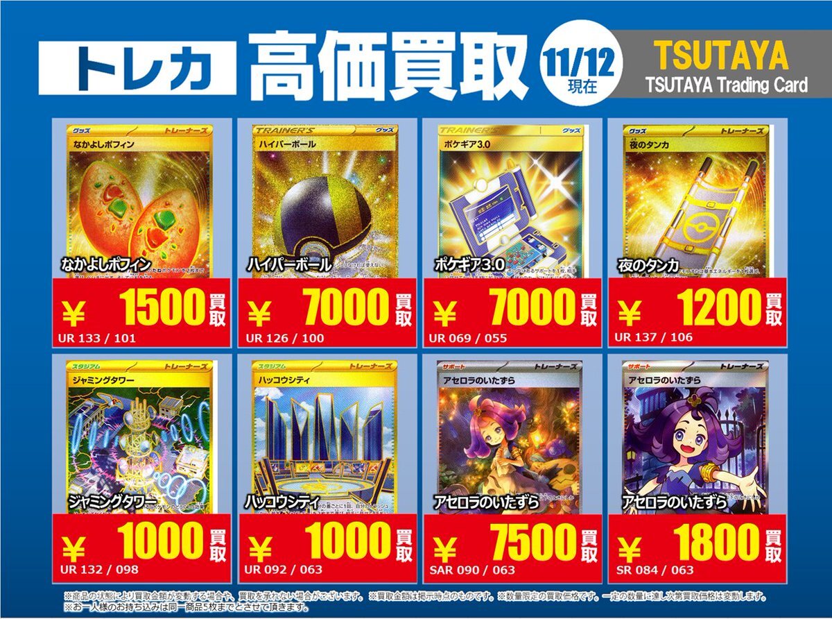 【高価買取情報】 11/4まで #ポケモンゲーム #高額 ⑥ 高価買取商品をお持ち頂く場合は レジにてX掲載カードと必ずお伝え下さい。 申告が無い場合は通常価格での買取 となってしまいますのでお気を付け下さい。 ※在庫状況や商品状態で買取価格が変動 または終了する事がございます #TTC錦糸町店 pic.x.com/MQCrrJKy10