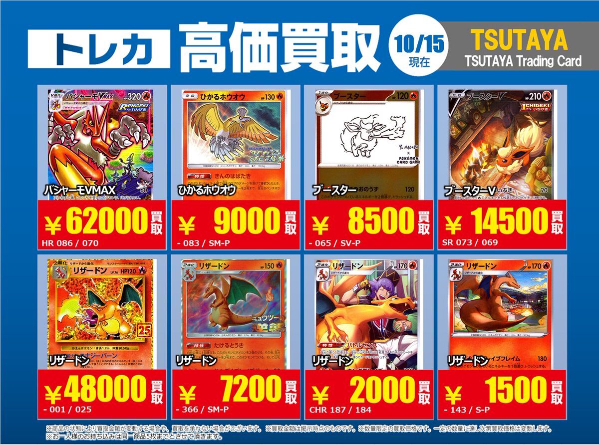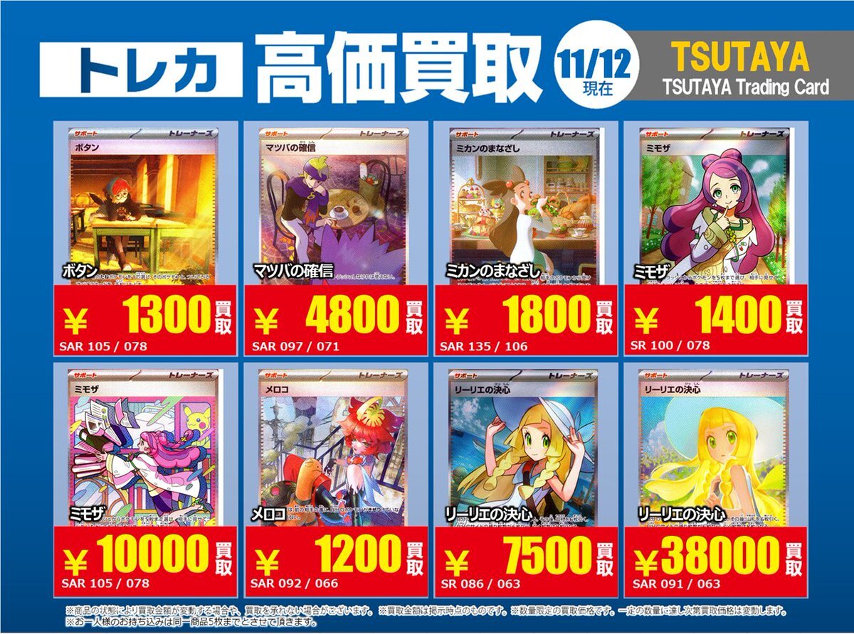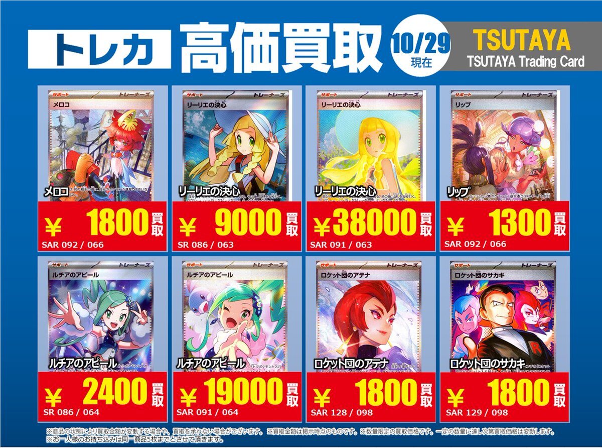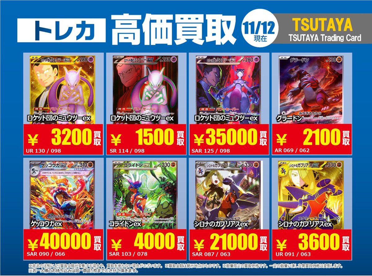 【高価買取情報】 11/4まで #ポケモンゲーム #高額 ⑥ 高価買取商品をお持ち頂く場合は レジにてX掲載カードと必ずお伝え下さい。 申告が無い場合は通常価格での買取 となってしまいますのでお気を付け下さい。 ※在庫状況や商品状態で買取価格が変動 または終了する事がございます #TTC錦糸町店 pic.x.com/MQCrrJKy10