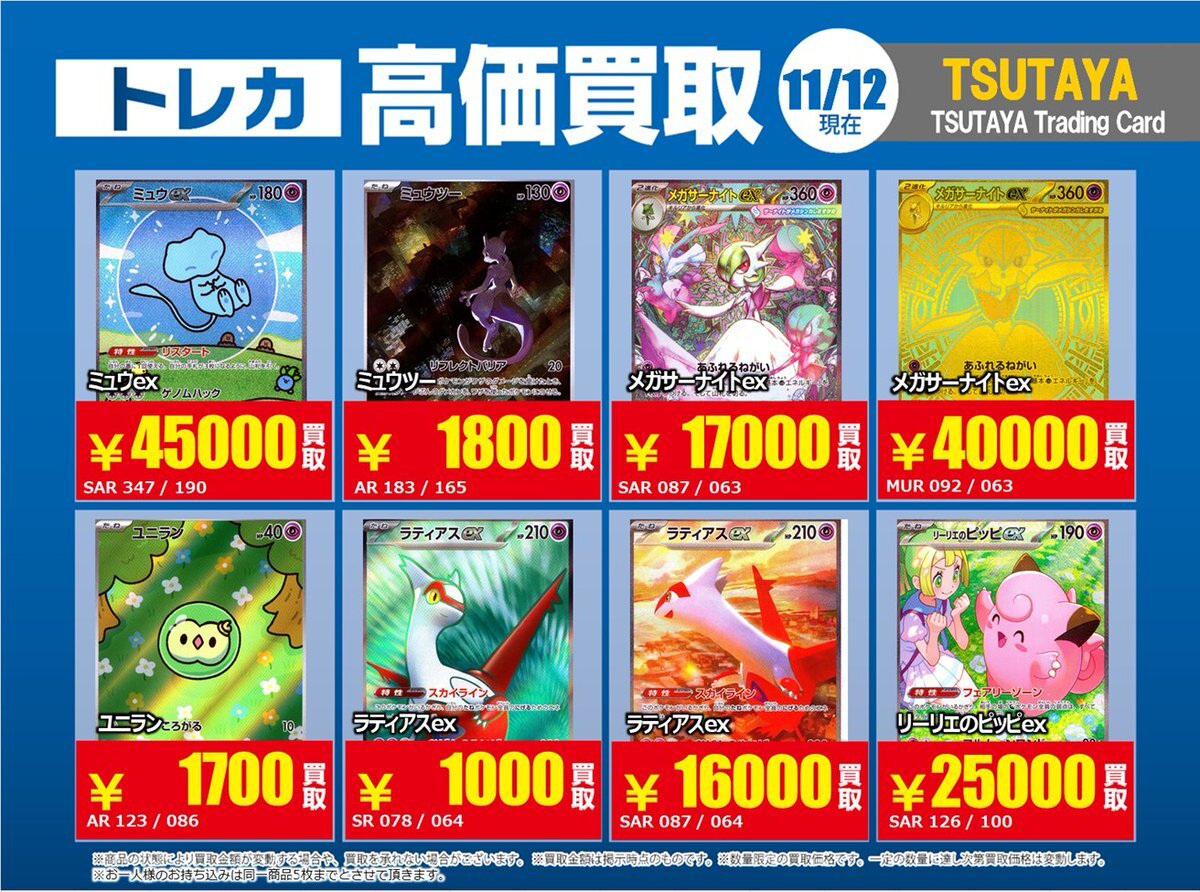 【高価買取情報】 11/4まで #ポケモンゲーム #高額 ③ 高価買取商品をお持ち頂く場合は レジにてX掲載カードと必ずお伝え下さい。 申告が無い場合は通常価格での買取 となってしまいますのでお気を付け下さい。 ※在庫状況や商品状態で買取価格が変動 または終了する事がございます #TTC錦糸町店 pic.x.com/l2qlNsvwWN