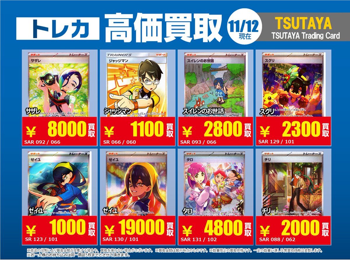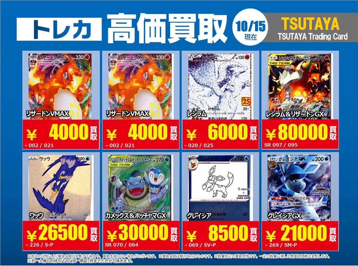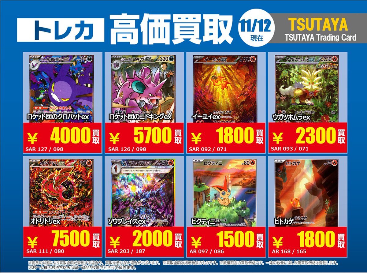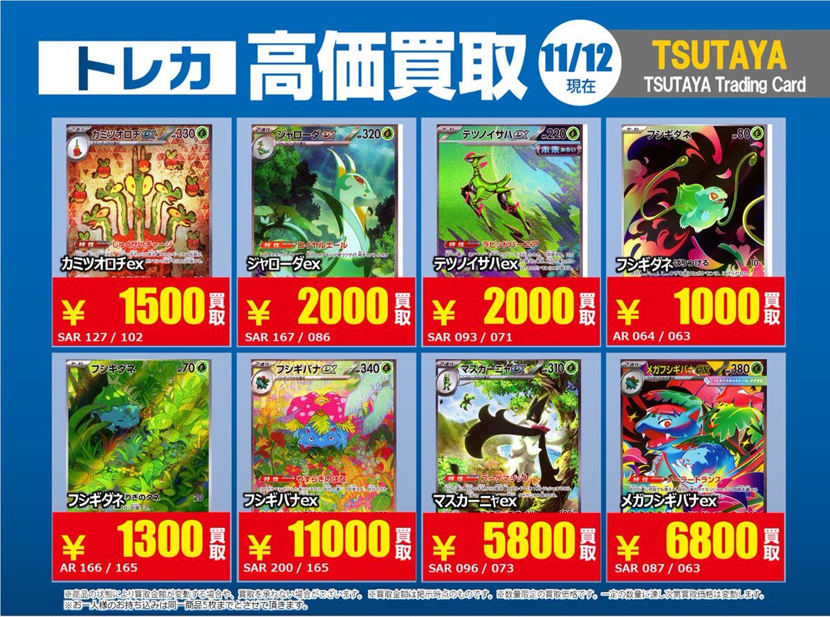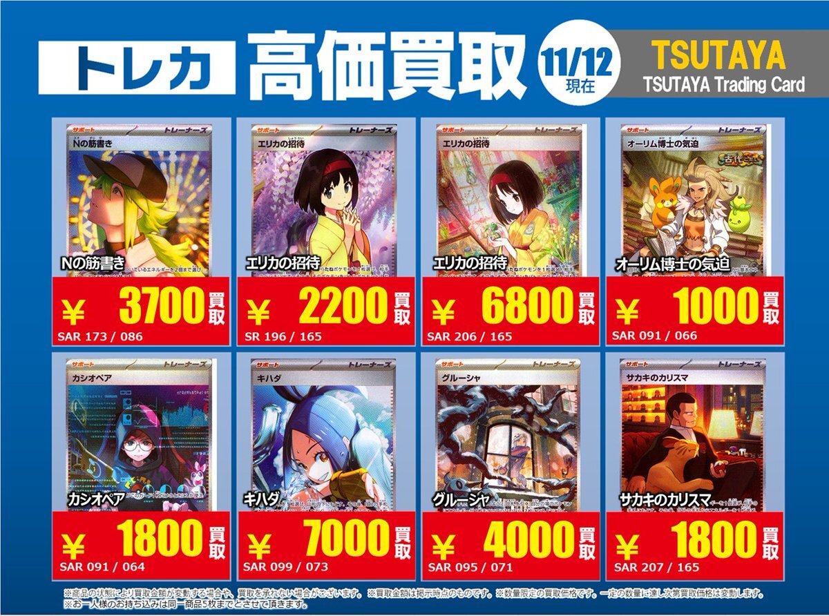 【高価買取情報】 11/4まで #ポケモンゲーム #高額 ⑧高価買取商品をお持ち頂く場合は レジにてX掲載カードと必ずお伝え下さい。 申告が無い場合は通常価格での買取 となってしまいますのでお気を付け下さい。 ※在庫状況や商品状態で買取価格が変動 または終了する事がございます #TTC錦糸町店 pic.x.com/HFcM4h5SpL