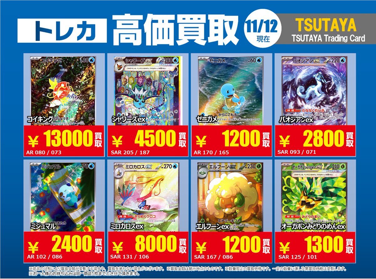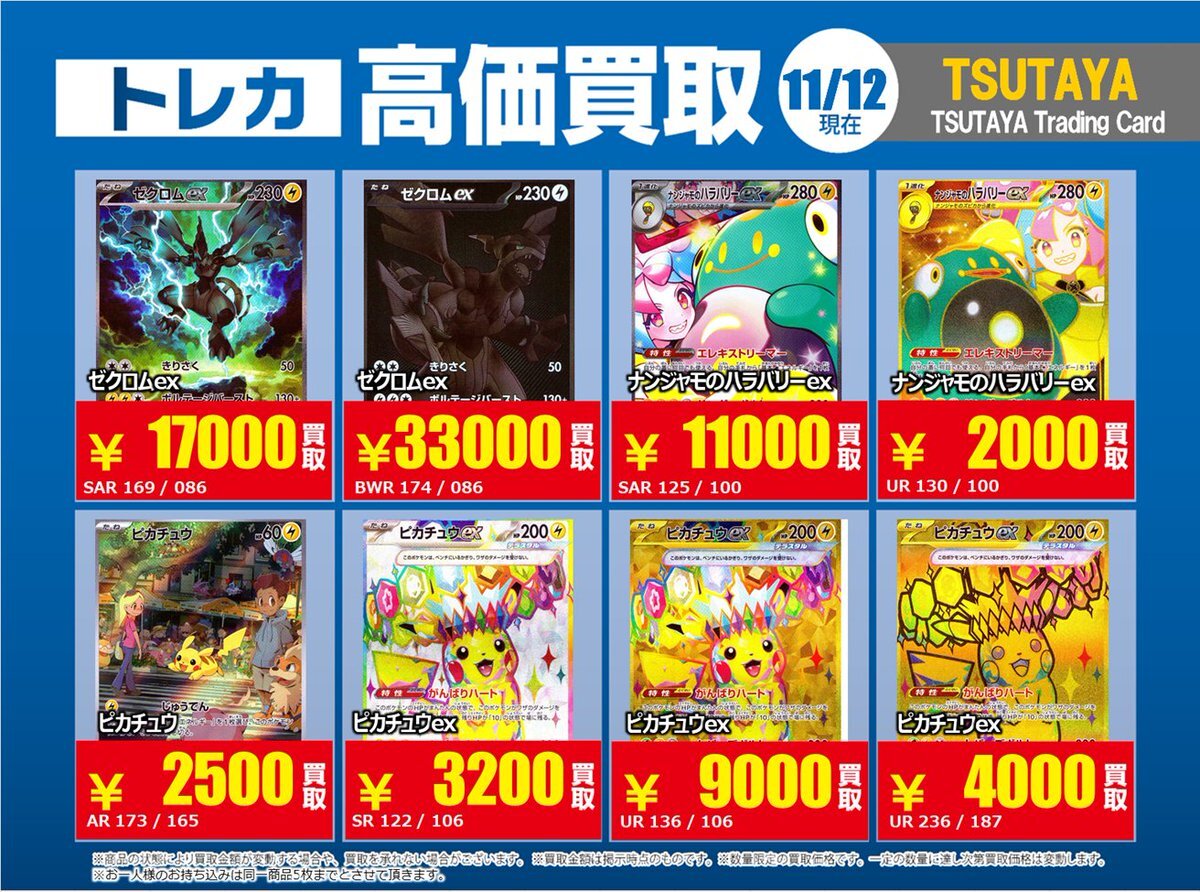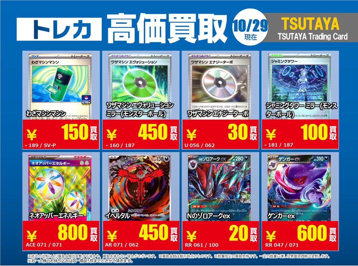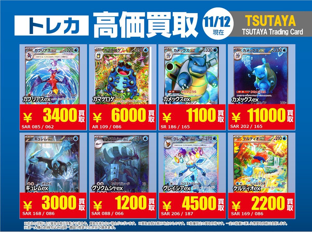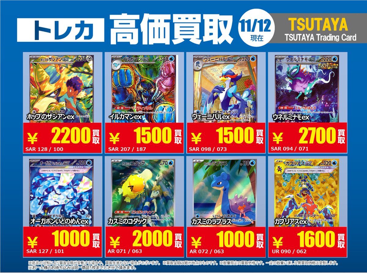 【高価買取情報】 11/4まで #ポケモンゲーム #高額 ⑧高価買取商品をお持ち頂く場合は レジにてX掲載カードと必ずお伝え下さい。 申告が無い場合は通常価格での買取 となってしまいますのでお気を付け下さい。 ※在庫状況や商品状態で買取価格が変動 または終了する事がございます #TTC錦糸町店 pic.x.com/HFcM4h5SpL